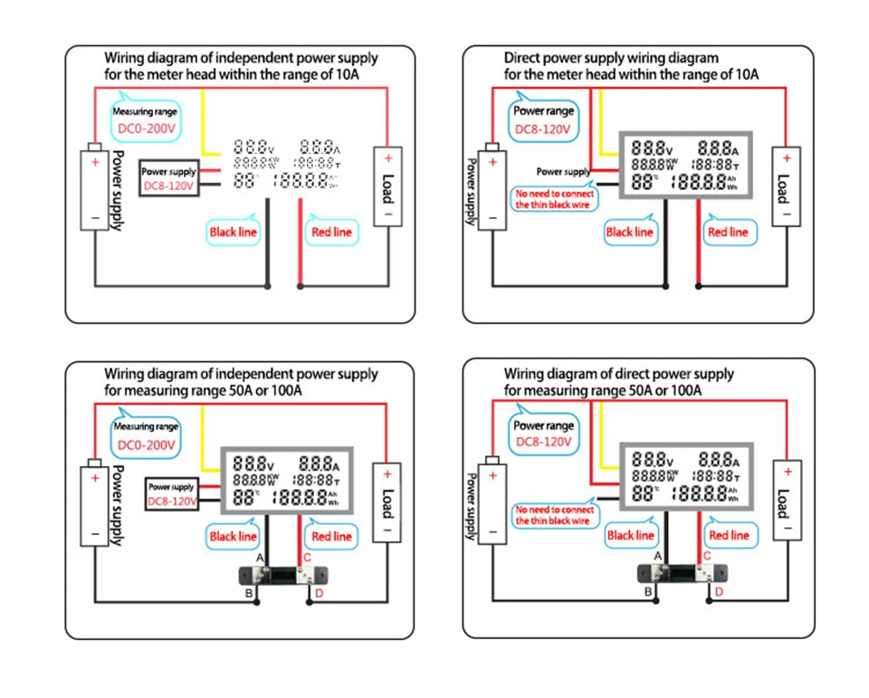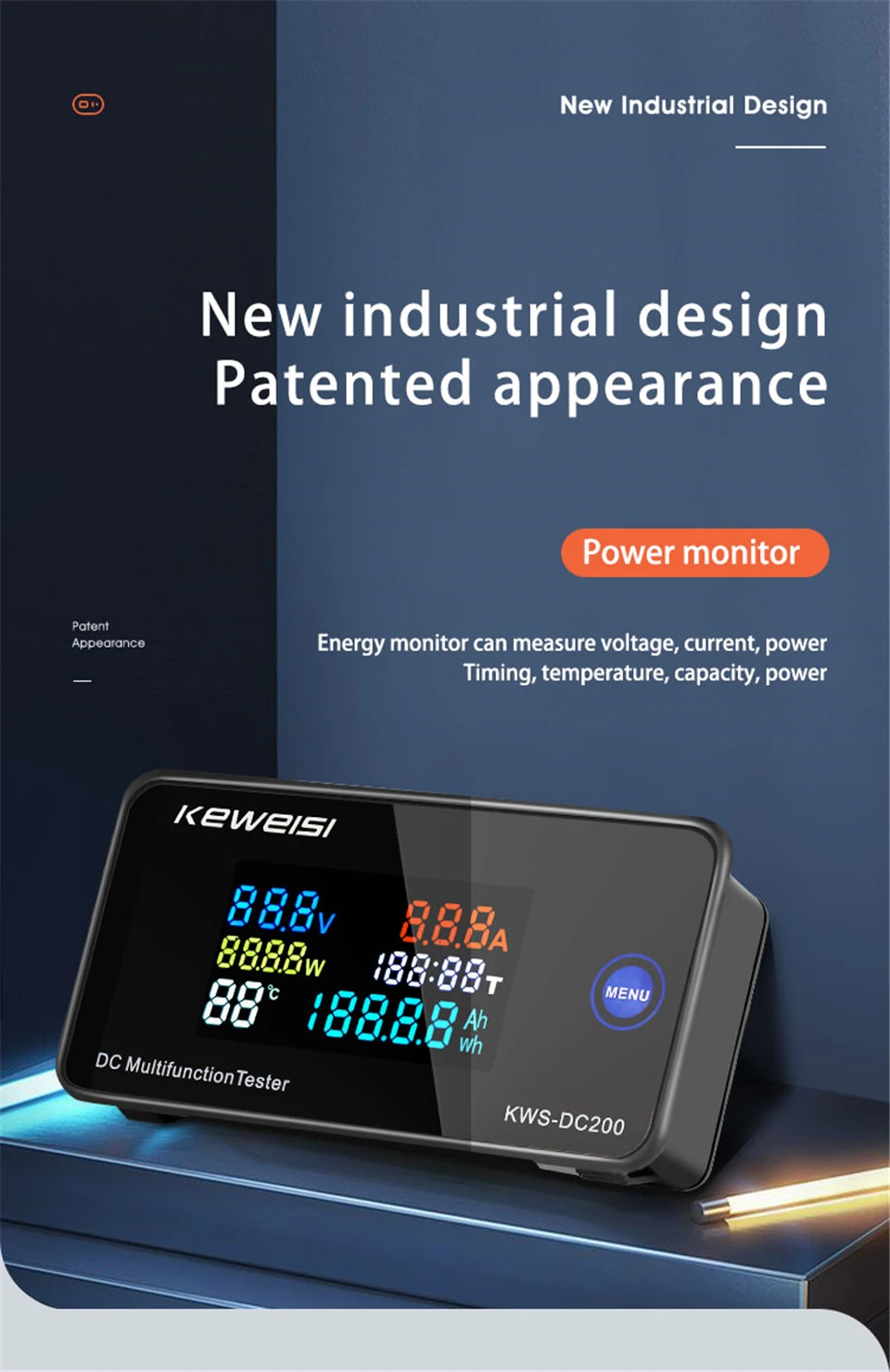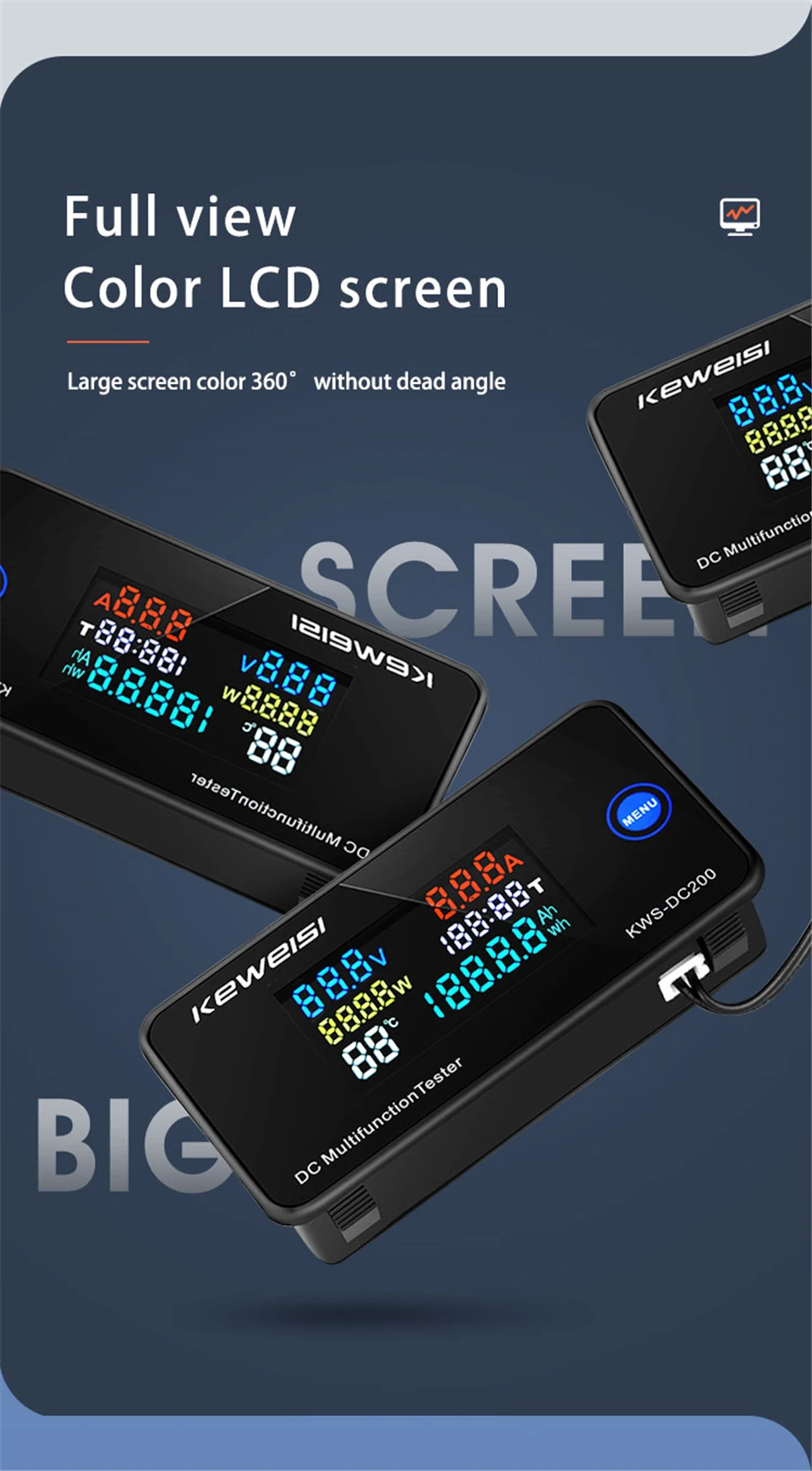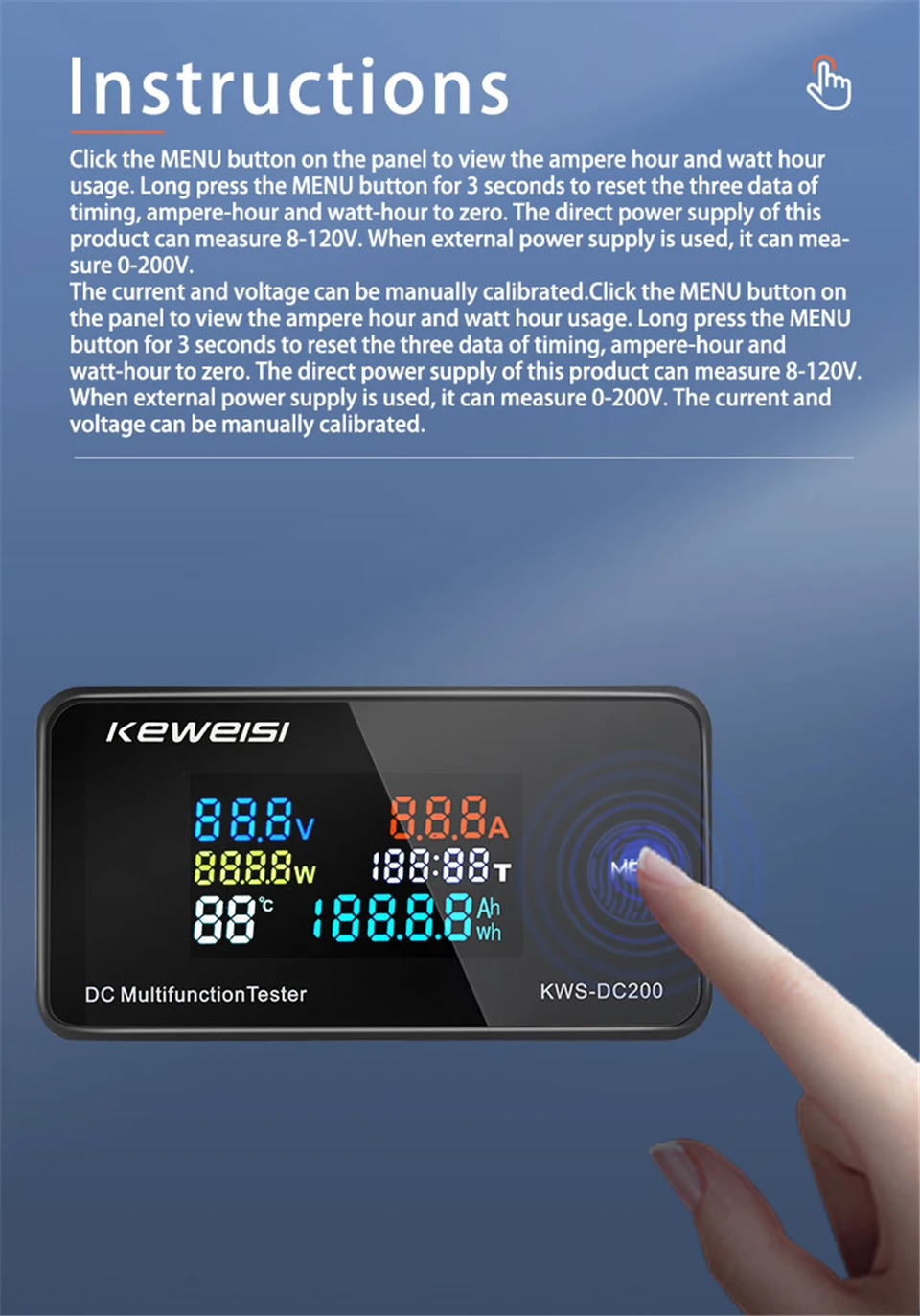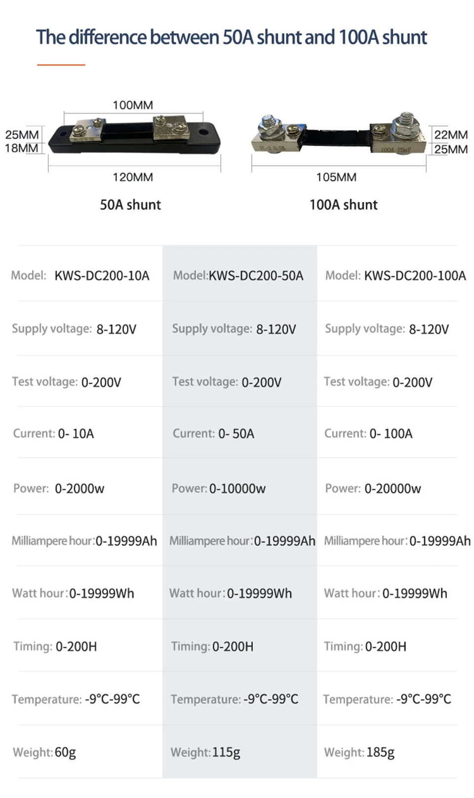 Especificación:Modelo: DC200-10AVoltaje de alimentación: 8-120VVoltaje de prueba: 0-200VCorriente 0-10APotencia: 0-2000wHora de miliamperios: 0-199999Hora de vatios: 0-19999 WhTemporización: 0-200HTemperatura: -9C-99CPeso: 60 gModelo: DC200-50AVoltaje de alimentación: 8-120VVoltaje de prueba: 0-200VCorriente: 0-50APotencia.0-10000wHora de miliamperios: 0-199999Hora de vatios: 0-19999 WhTemporización: 0-200HTemperatura: -9C-99CPeso: 115 gModelo: DC200-100AVoltaje de alimentación: 8-120VVoltaje de prueba: 0-200VCorriente: 0-100APotencia.0-20000wHora de miliamperios 0-199999Hora de vatios: 0-19999 WhTemporización: 0-200HTemperatura: -9C-99CPeso: 185 g