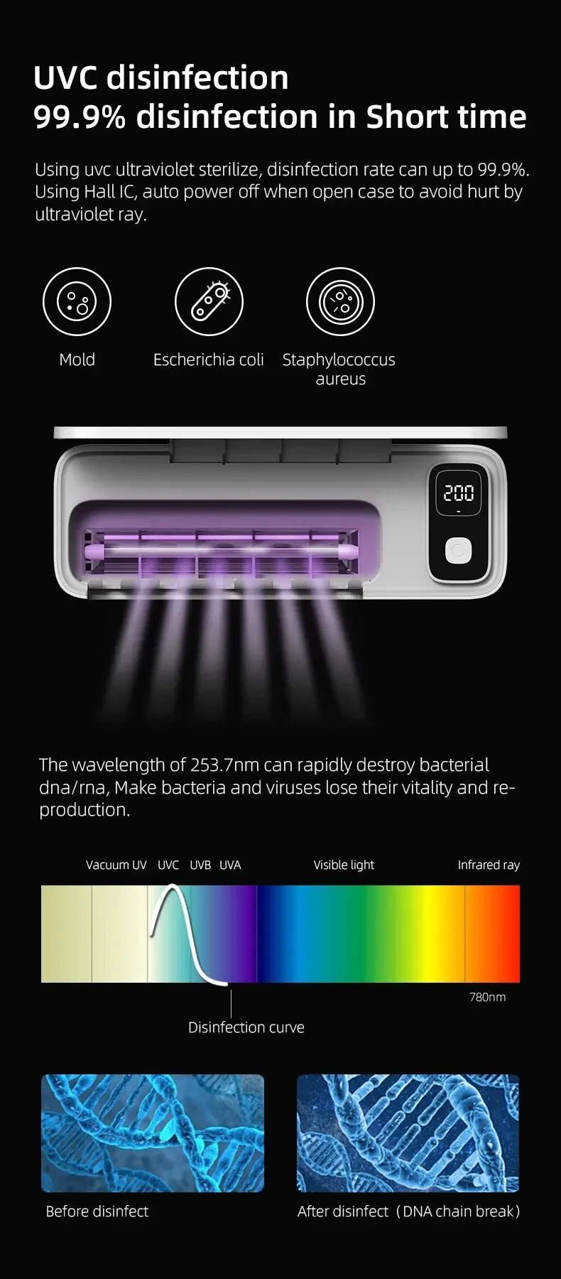 Durante este período, la luz verde parpadea cada 16 segundos para indicar que está en modo automático hasta que la luz roja de baja potencia parpadee automáticamente.En el modo automático, haga clic en el botón, la pantalla mostrará "OFF", se cancelará el modo automático y se ingresará al modo de desinfección único.
