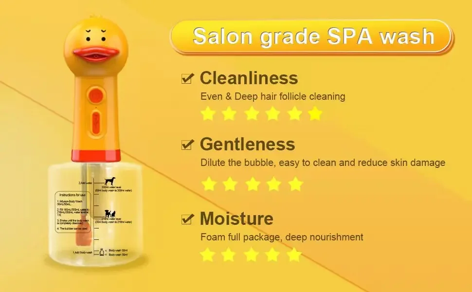 2 Capacidad del producto El dispensador de jabón se puede llenar con gel de ducha y agua a la vez, lo que facilita completar el gel de ducha necesario para lavar a los perros sin la necesidad de una segunda adición de agua, lo que puede ahorrarle dinero.