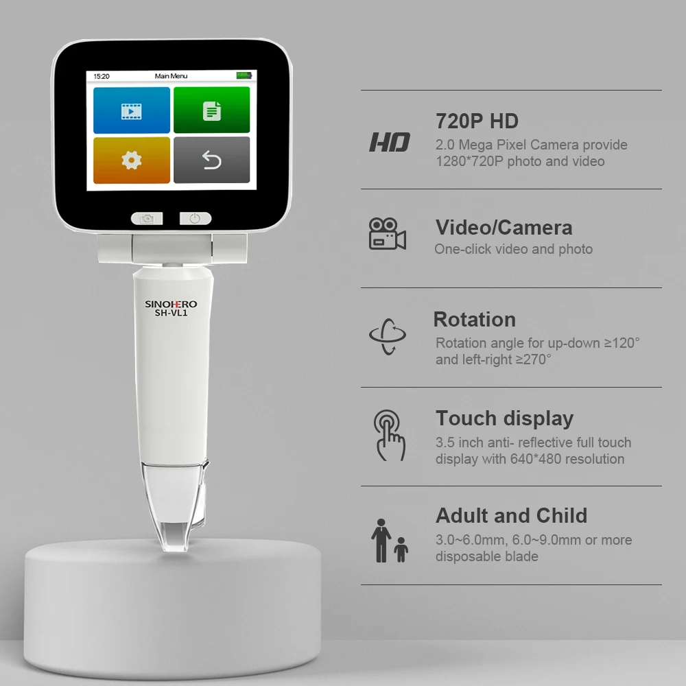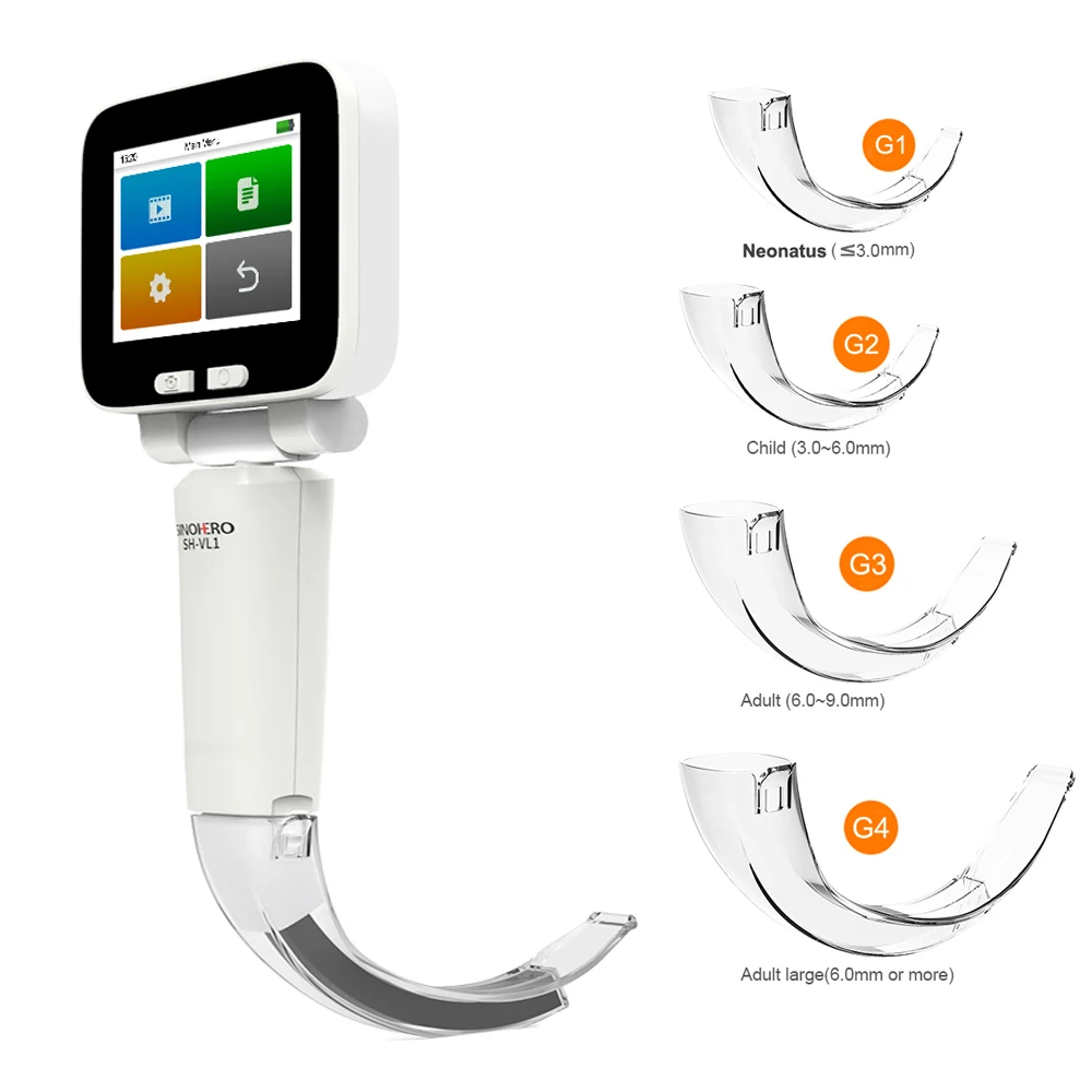 SINOHERO SH-VL1 es un videolaringoscopio reutilizable, proporciona una mejor visualización para la intubación difusa, lo que hace que las vías respiratorias difíciles sean fáciles y rápidas, es 3.Pantalla a color completamente táctil de 5", 2.Cámara de 0 megapíxeles, almacenamiento de 16 GB, batería recargable incorporada, con diferentes cuchillas desechables.SH-VL1 Tasas de éxito de intubación más altas que otras.
