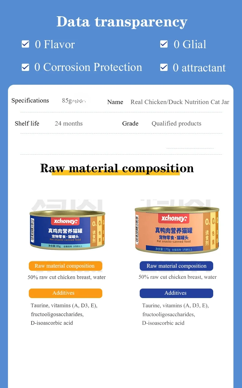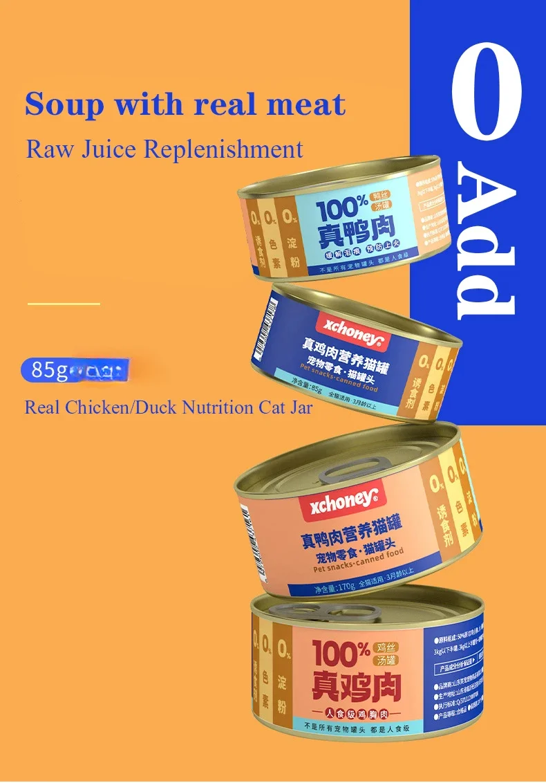 Latas hidratantes para gatos, comida húmeda, bocadillos para mascotas, 85g, pollo, pato, enlatado, venta al por mayor