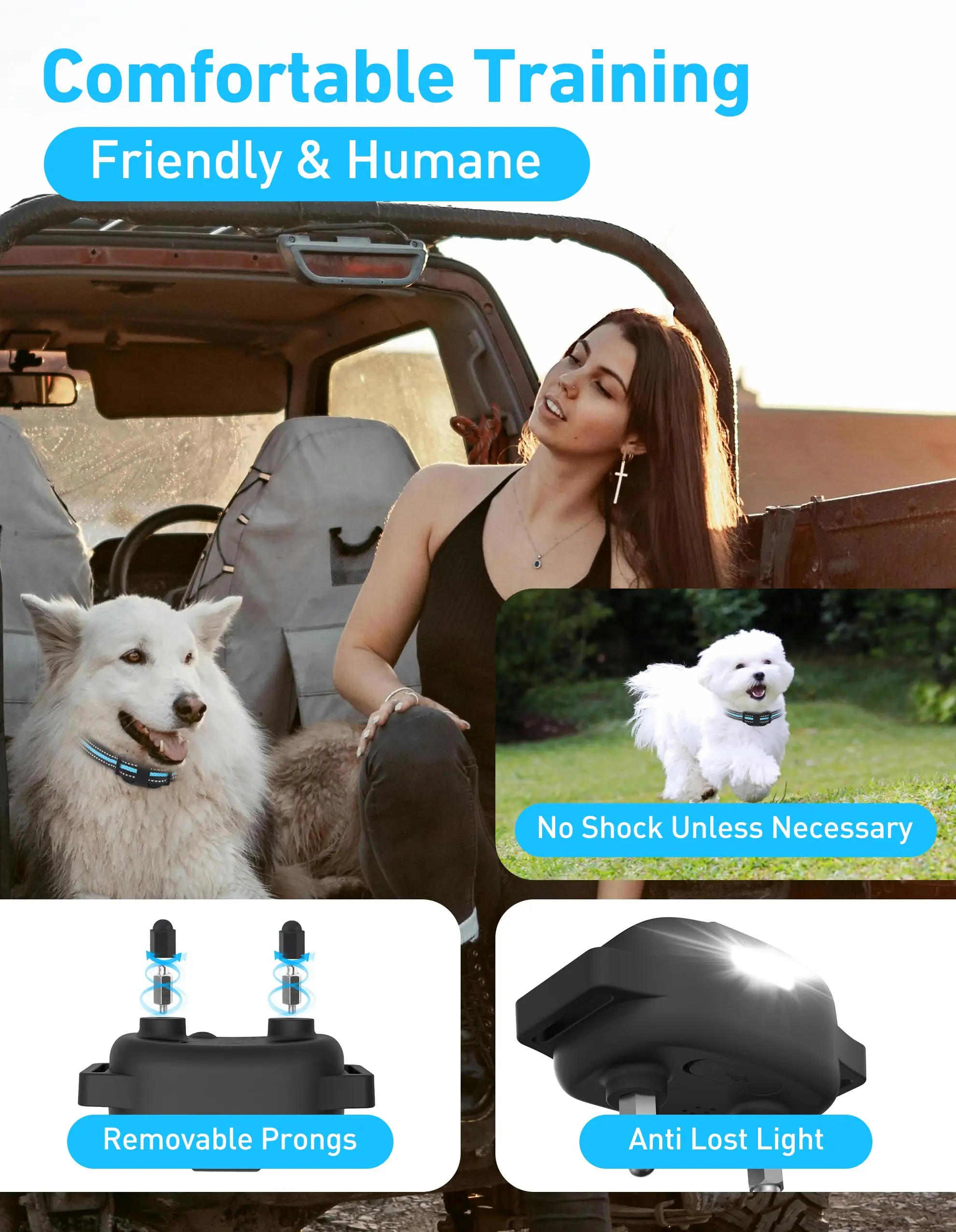 Sin golpes a menos que sea necesario: si no necesita utilizar la función de choque, puede quitar las puntas.En comparación con otros collares de entrenamiento, nuestro collar tiene una interfaz suave y no causará ningún daño a su perro.