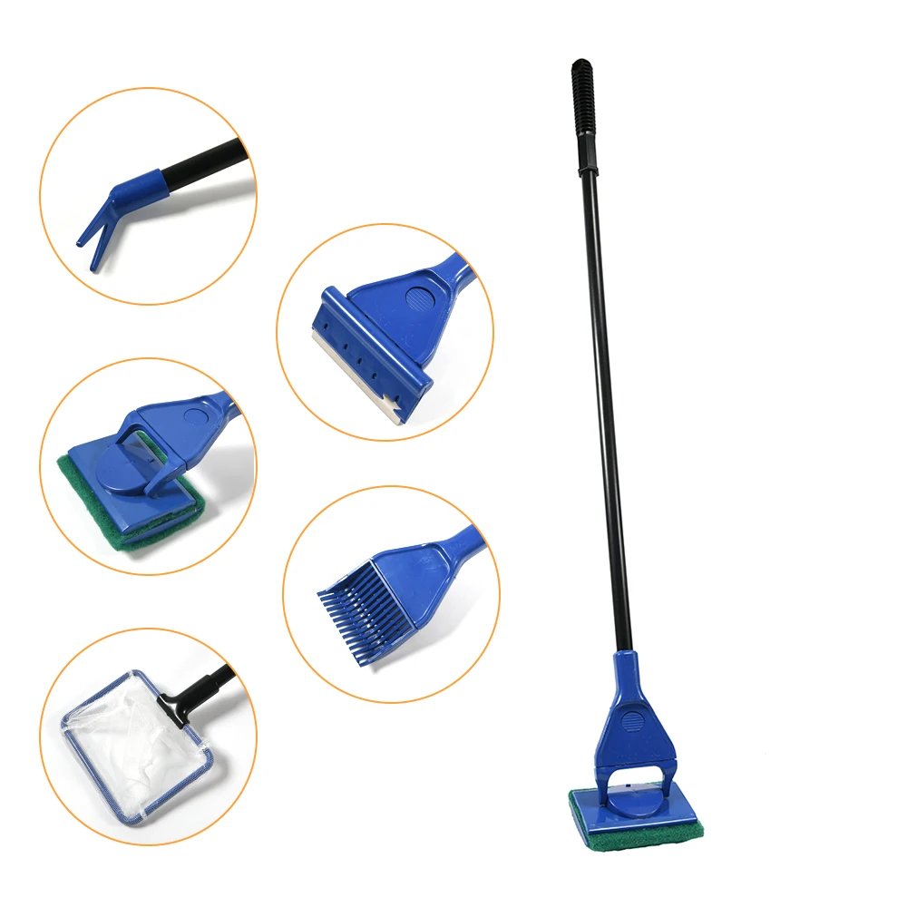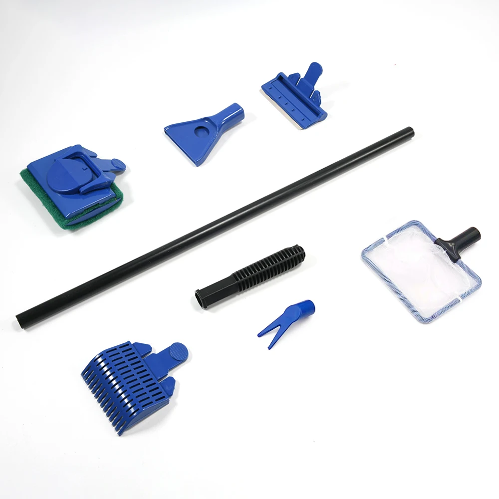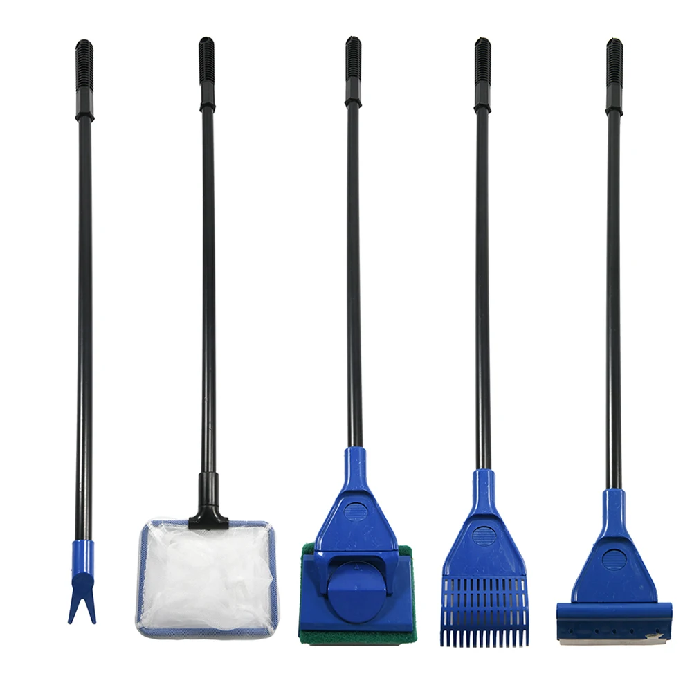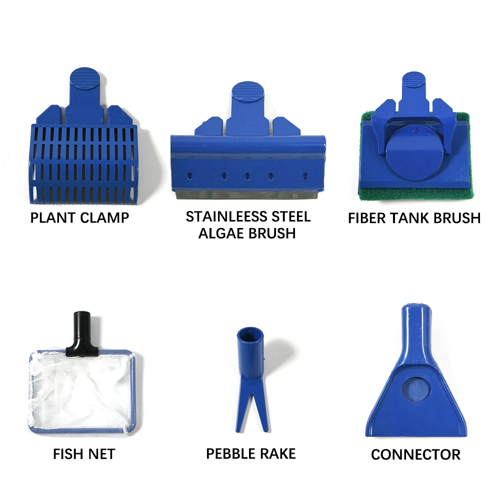 Los 5 accesorios, una red de pesca, un raspador de algas, una esponja de ventana, un tenedor de planta y un rastrillo de grava,