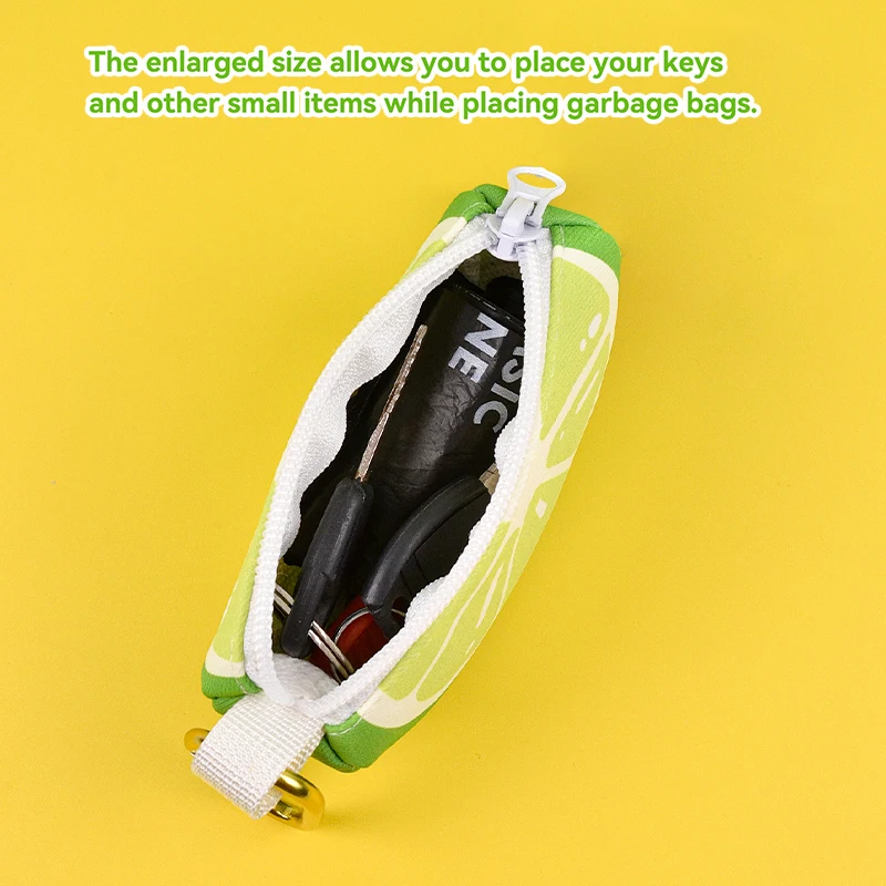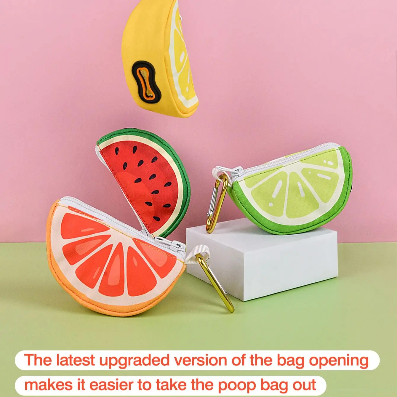 Lindo almacenamiento de bolsas para excrementos de mascotas con frutas, se puede conectar a cualquier perro Correa, bolso y correa no incluidos, edición especial limitada.