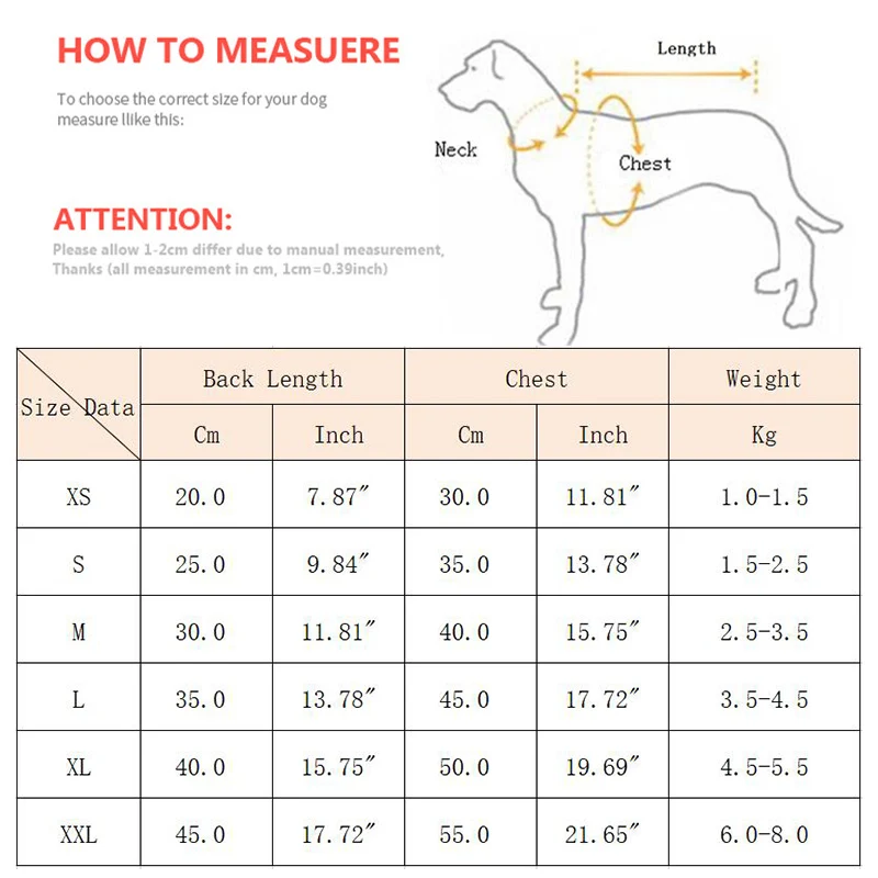1. Por favor, compruebe las medidas de su mascota para asegurarse de que la ropa se ajuste a las mascotas antes de realizar el pedido (1 pulgada=2,54 cm)
