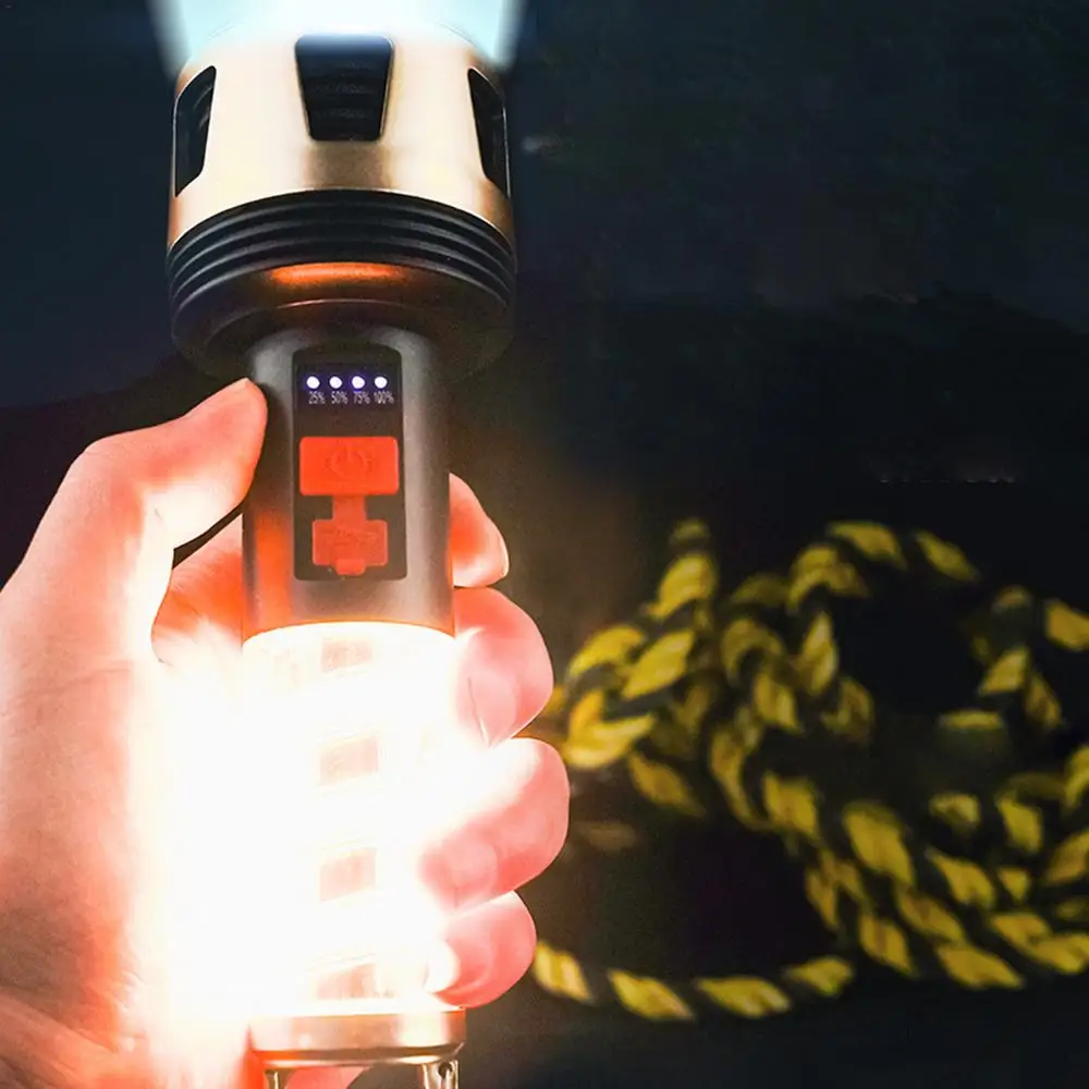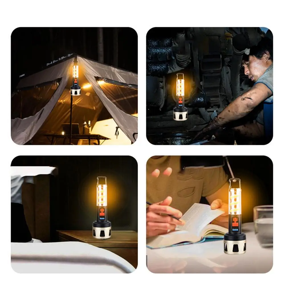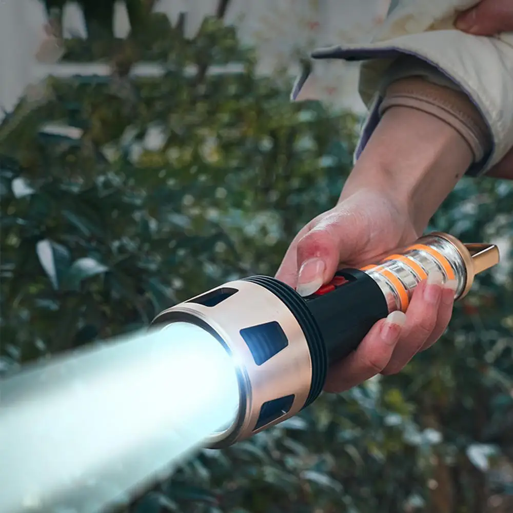 Ilumina tu viaje de camping con nuestra linterna LED recargable. Con cuatro niveles de indicador de potencia LED, la difusión uniforme de luz de 360 grados proporciona una fuente de luz brillante y estable. Lluvia. No hay problema. Nuestras linternas se pueden iluminar normalmente bajo la lluvia. Con una batería de larga duración, tendrás luz toda la noche.