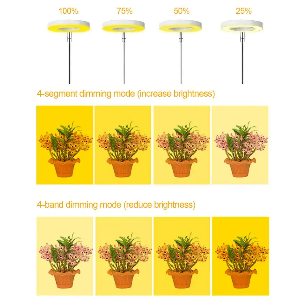 2.LED Diodes: Plant growth lights have more new technology LED diodes to make them brighter and more efficient. The plant growth light has 4 brightness settings, so you can easily adjust the brightness of the light.