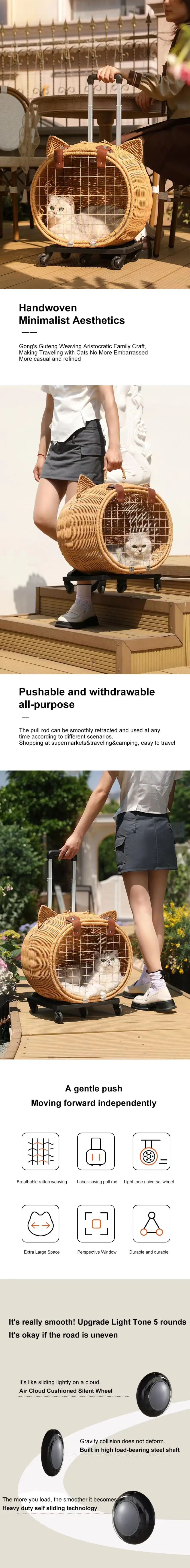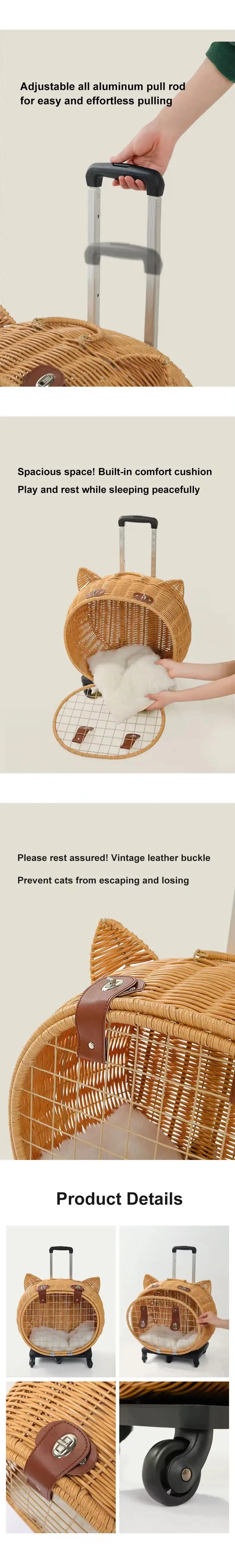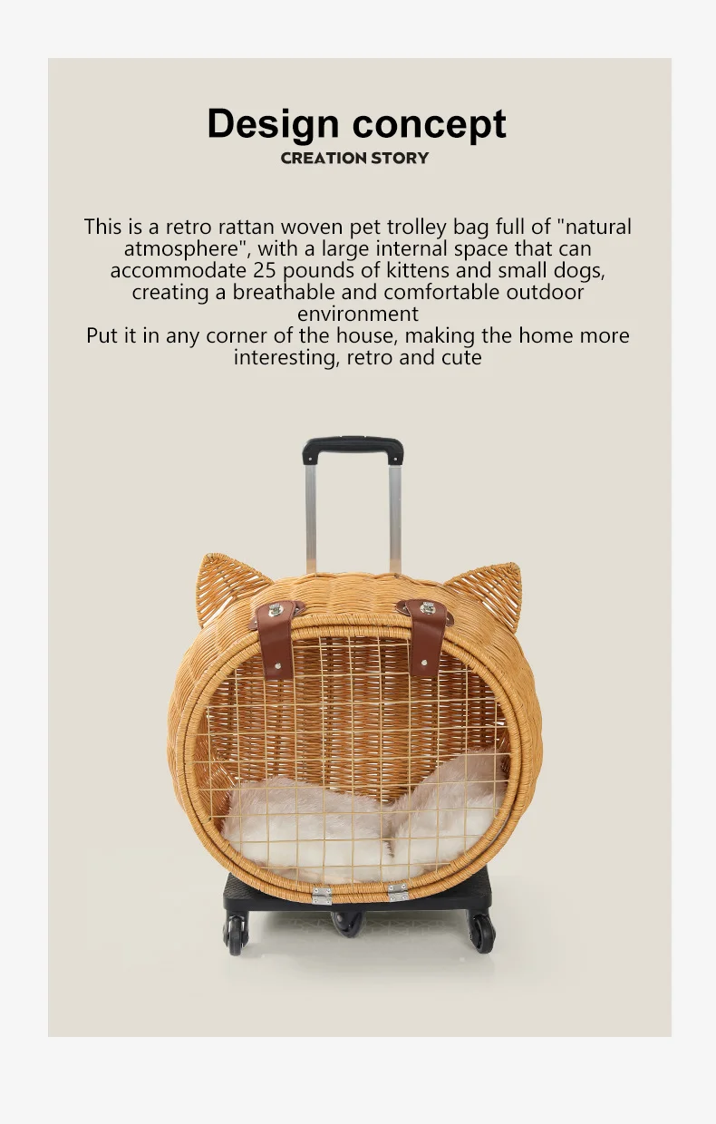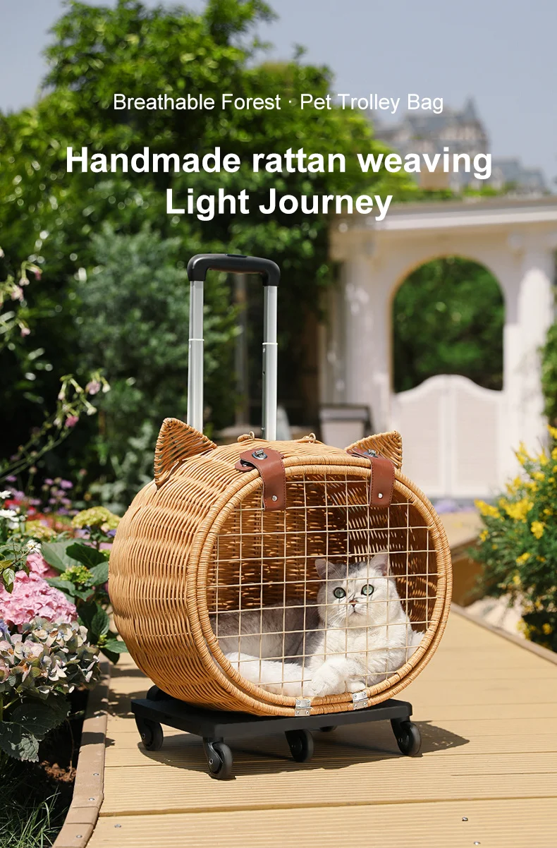 Maleta tejida de bambú portátil para exteriores con ruedas para gatos y perros, mochila antiestrés para gatos, caja con ruedas con cabeza de gato, tejido de ratán