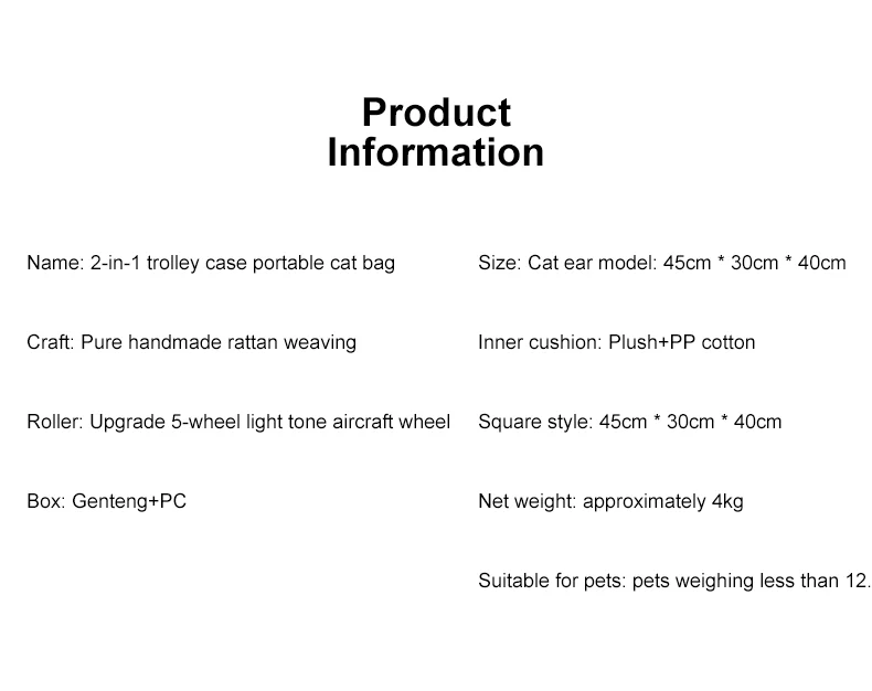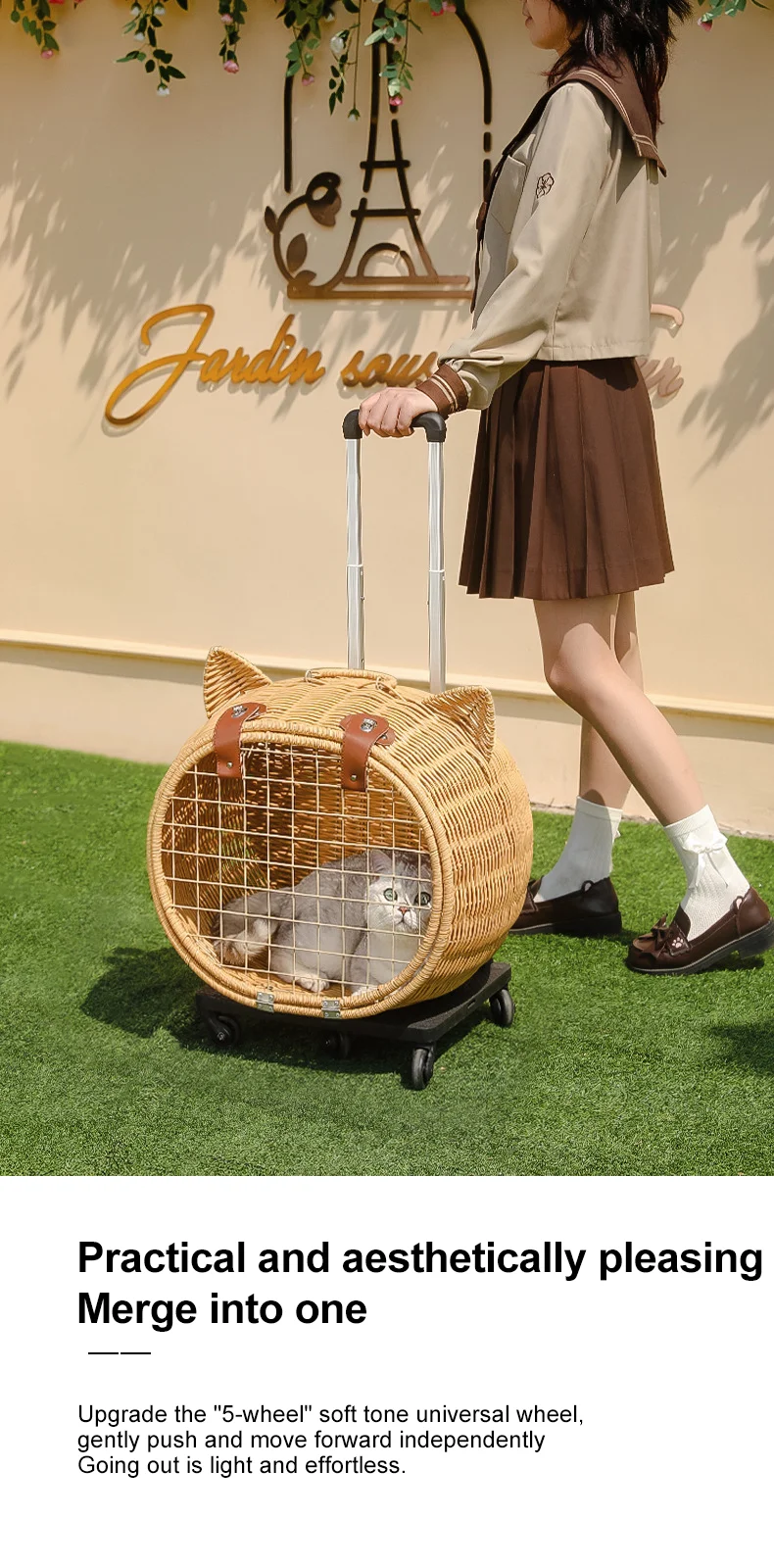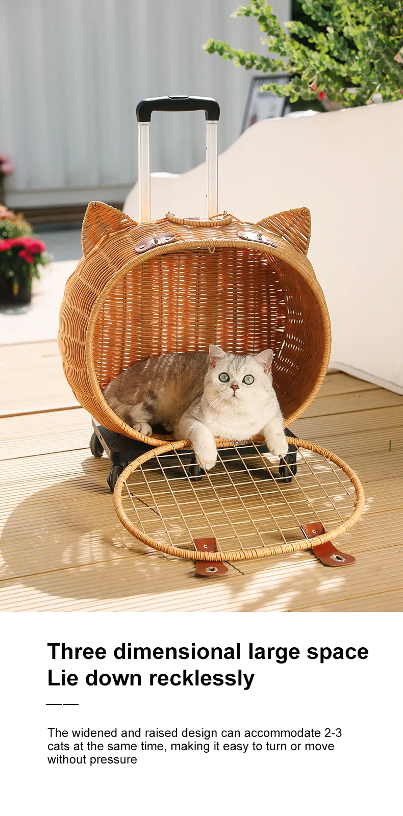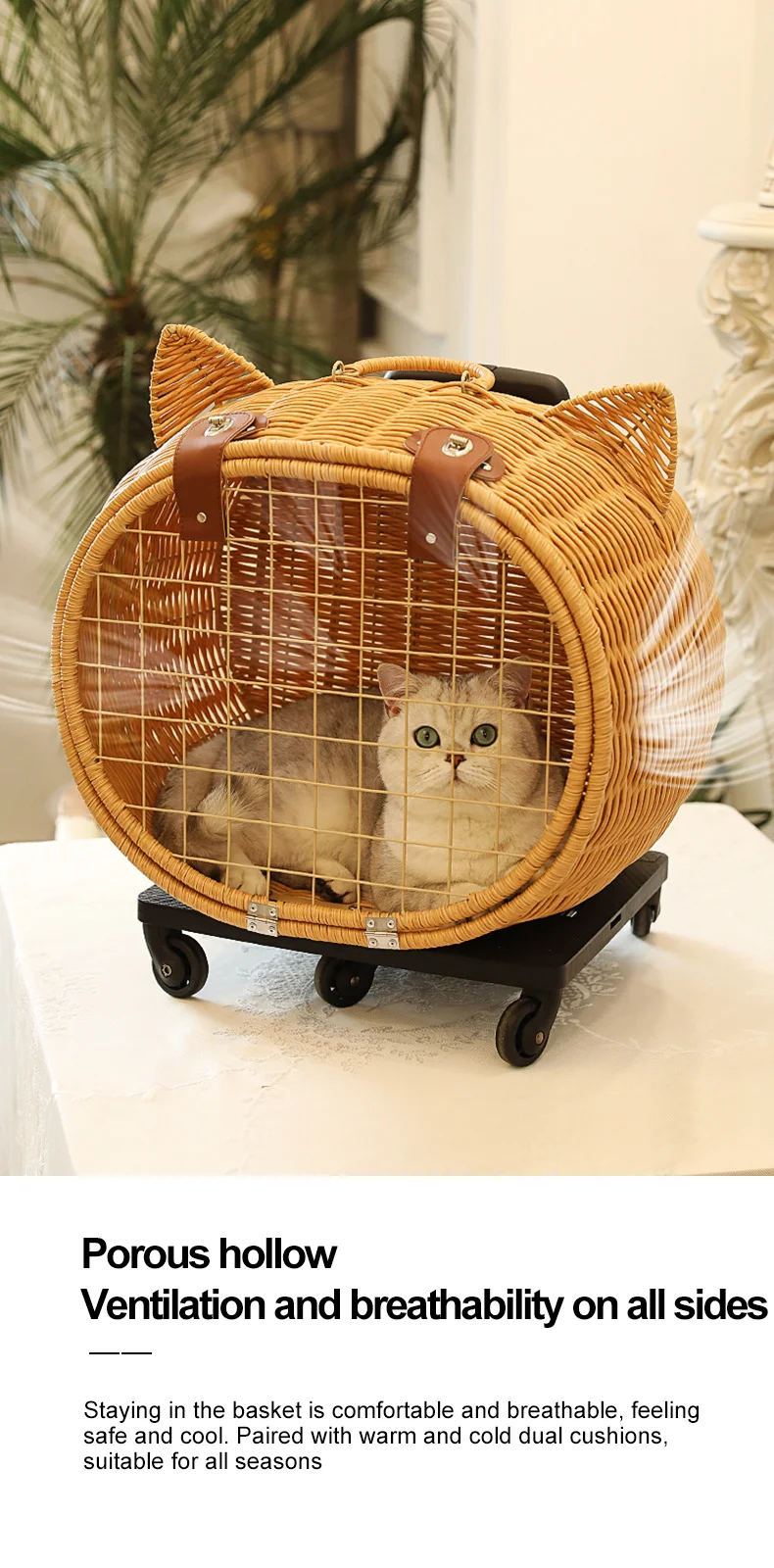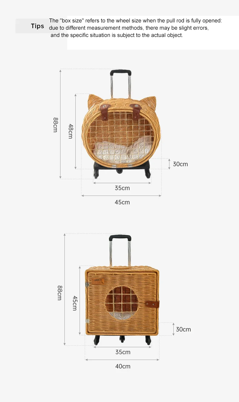 Maleta tejida de bambú portátil para exteriores con ruedas para gatos y perros, mochila antiestrés para gatos, caja con ruedas con cabeza de gato, tejido de ratán