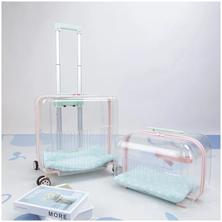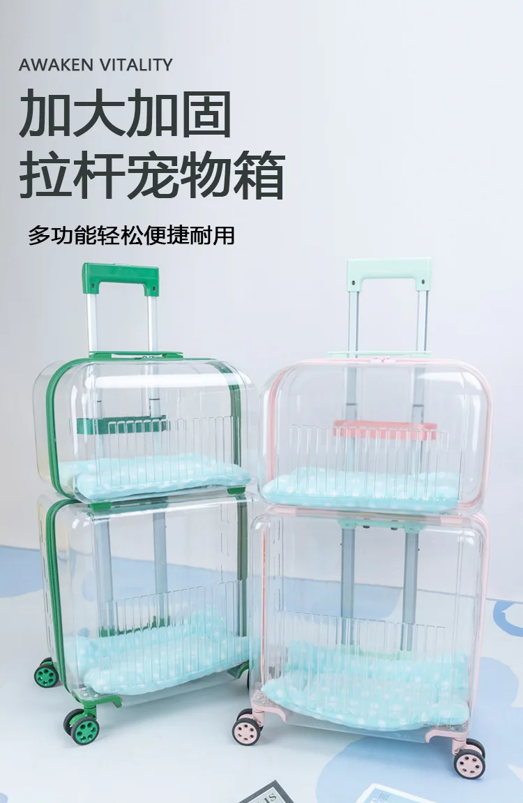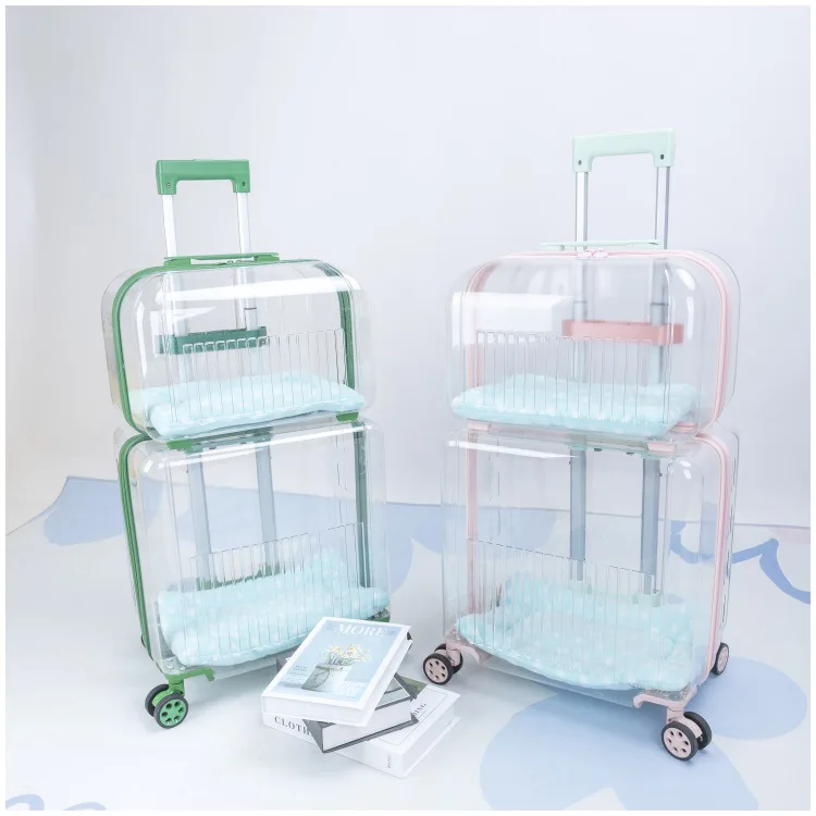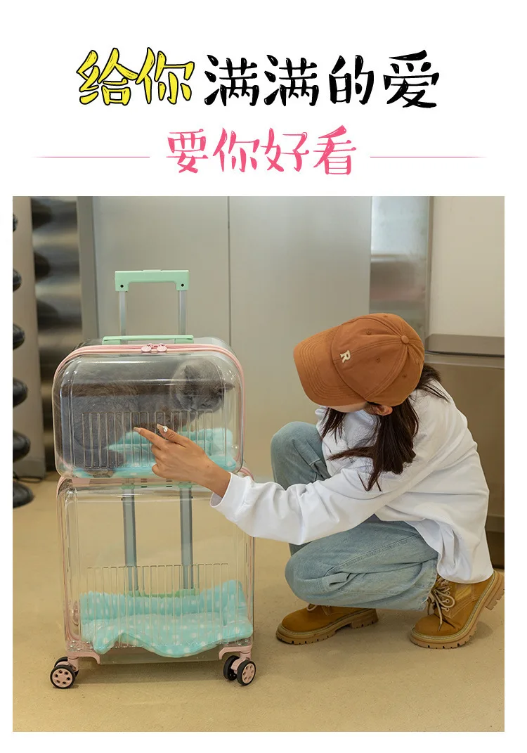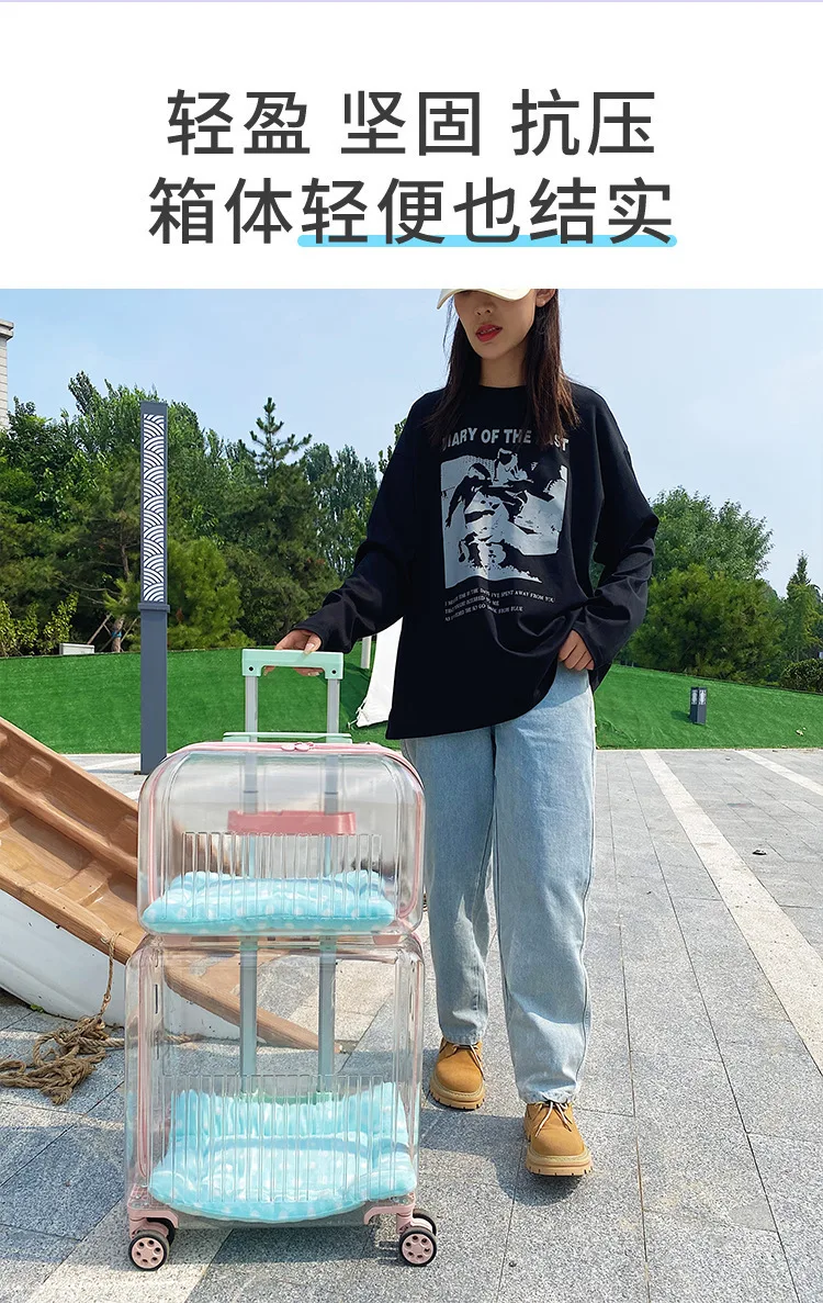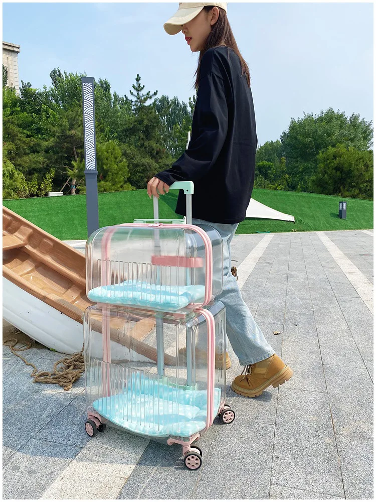 Maleta transparente con ruedas para mascotas, bolsa para gatos, cómoda para salir, maleta de doble capa para dos o tres gatos y perros, transpirable, de gran capacidad