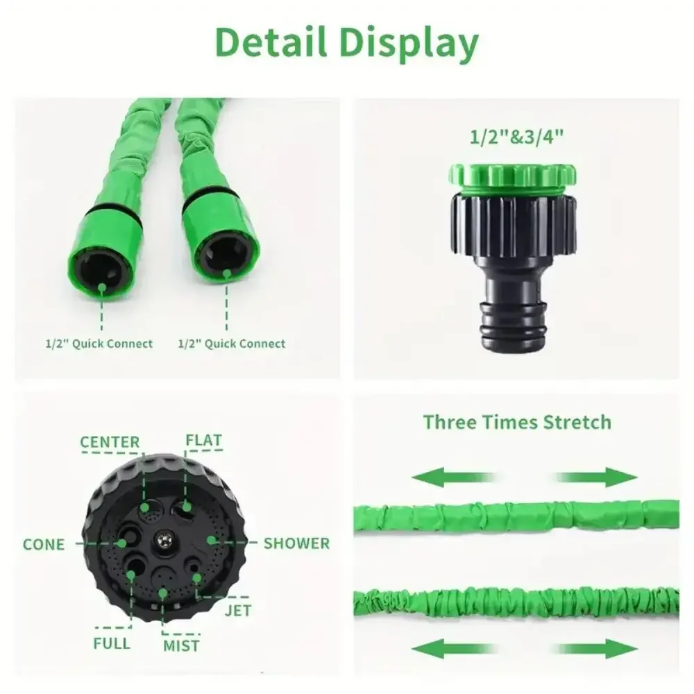 El paquete incluye: una pistola de agua de 7 funciones, una tubería de agua, un conector de un tercio y un manual de instrucciones en inglés. Especificaciones del producto: Se puede extender 3 veces cuando la presión del agua es suficiente y aproximadamente 2. 5 veces cuando la presión del agua es insuficiente