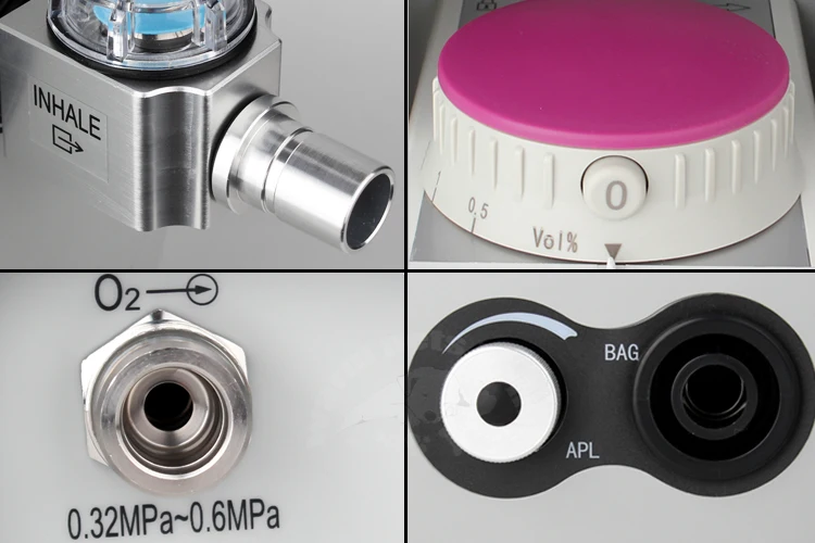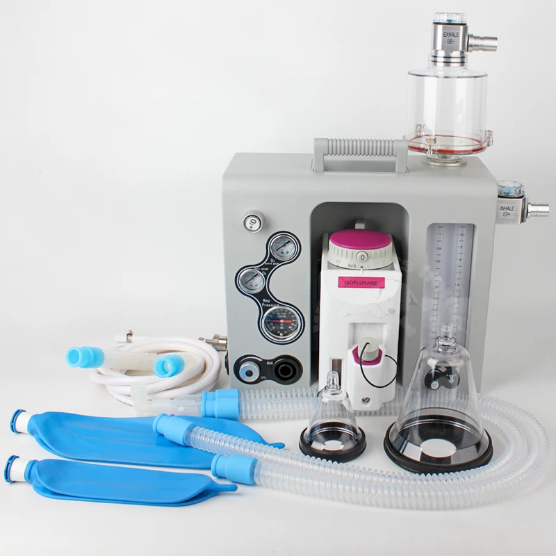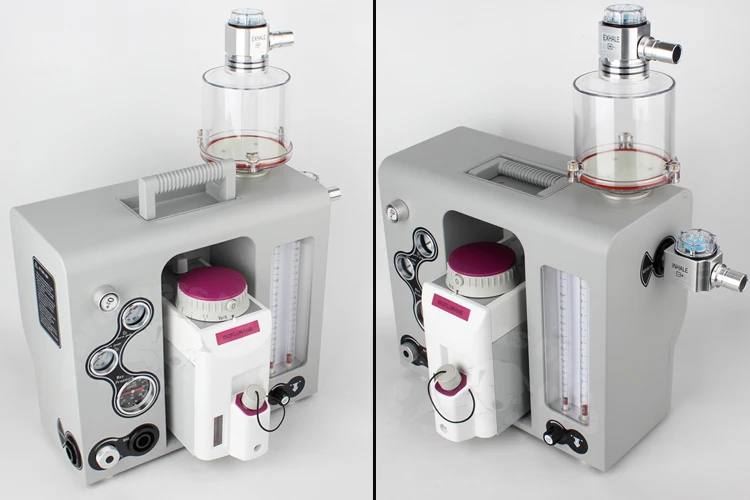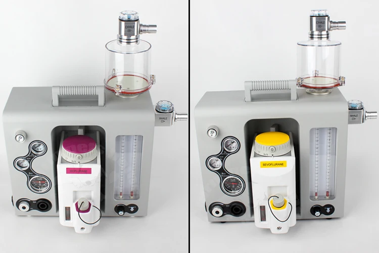 Configuración estándarMáquina de anestesia portátil aprobada por la CECompacto, liviano y portátil, se puede transportar con un estuche con varilla, colocar sobre la mesa y ensamblar en el carrito.Adecuado para animales pequeños, Jackson o Bains Absorber disponibleDiseñado específicamente para acomodar un flujo bajoDispositivo de montaje de vaporizador de cambio rápido y barra selectoraDiseño de circuito de respiración hermético profesional, proporciona una anestesia de gas estable, ahorra consumo de gas de anestesia y garantiza una sala de operaciones y un entorno de laboratorio limpios.Bote de cal de sodio externo y reutilizable, observa y reemplaza fácilmente la cal de sodio.Con función de descarga de oxígeno para garantizar la demanda de anestesia clínica y la demanda de suministro Oxgyen.Con válvula reductora de presión APL para evitar que la presión dañe al animal, garantice la seguridad del animal.Sistema de descarga de aguas residualesVálvula de inspiración y caducidad visiblePodría actualizarse libremente al medidor de flujo de oxígeno y aire o oxígenoBastidor de módulos con material médico de poliéster con tecnología de pulverización superior, alta resistencia y peso ligero.Con estuche de transporte, cómodo de llevar y transportar.Fácil de desmontar y montar todos los componentes, conveniente para la limpieza y el mantenimiento.Especificación:Aplicación: animal de 0,5 ~ 100 kgModo de ventilación: Cerrado, medio cerrado, medio abiertoVolumen de marea (modo manual): 10 ~ 2000 mlPresión de gas: 0,25 ~ 0,65 MpaMedidor de flujo: Oxígeno dos tubos: un tubo: 0,1 ~ 1, un tubo: 1 ~ 10 L/MVálvula APL: 0,5 ~ 6,0 KpaAl ras de OXIGEN: 25~75L/minI:E: Como operación del médicoBPM: como operación del médicoMonitoreo: Presión de las vías respiratorias, modo respiratorio.Tres medidores: uno para la presión de la fuente de oxígenoUno para la presión de trabajo del oxígeno.Uno para la presión de las vías respiratoriasVaporizadorCon el último diseño innovador del sistema de suministro, los vaporizadores brindan una concentración precisa en condiciones variables de caudal, presión, temperatura, etc.Entregar agente de manera estable, compensar la temperatura automáticamente, entregar agente precisoSistema de entrega sofisticado, estable, rápido y preciso.Varios tipos de montaje.Dispositivo de bloqueo de seguridad para evitar que el gas anestésico se voltee accidentalmente.La gran ventana de visión es conveniente para observar los niveles de uso de medicamentos.EspecificaciónRango de concentración:Enflurane 0,2 a 5%Isoflurano 0,2 al 5%Halotano 0,2 a 5%Sevoflurano 0,2 a 8%Rango de flujo: 0,2 a 15 l/min0,2 a 10 l/min (uso normal) para concentraciones 5 vol%Volumen de llenado para agente:Aproximadamente 340 ml con mecha secaUnos 300 ml con mecha húmedaTipo de montaje:compatible con selectatecenchufe del draegersoporte de jaula (conicios ISO de 23 mm)soporte de jaula con interbloqueoPeso: 18,45 kgTamaño: 53*59*48