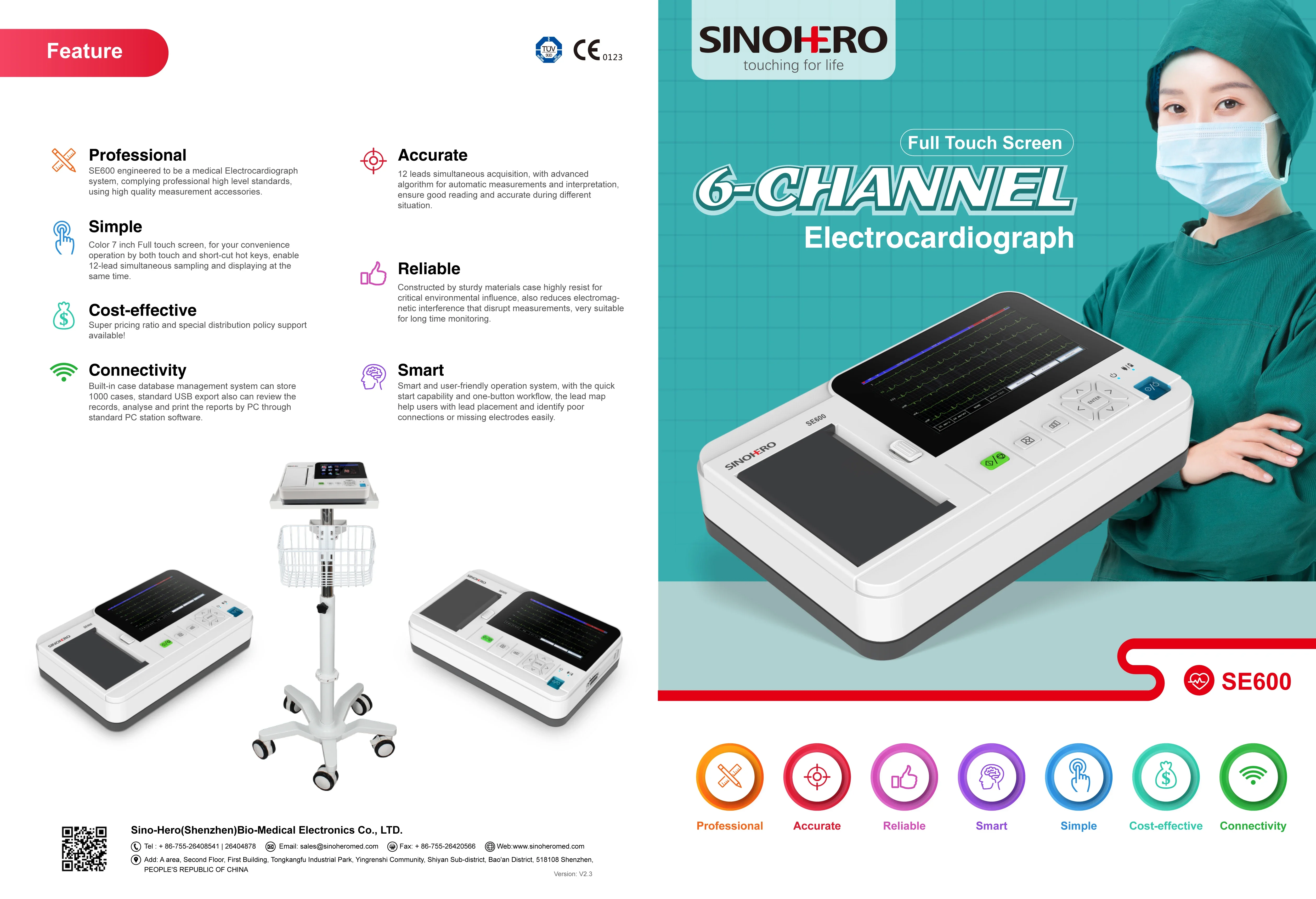 SE600 diseñó para ser un sistema de electrocardiógrafo médico, que cumple con estándares profesionales de alto nivel y utiliza accesorios de medición de alta calidad.