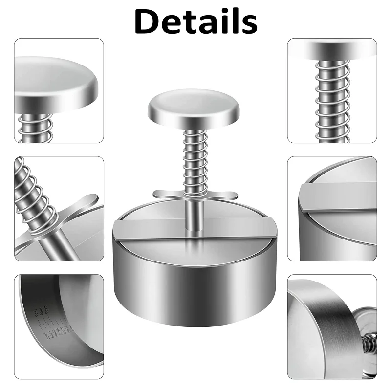 ��[VERSIÓN DE MEJORACIÓN】 El botón de émbolo de resorte compacta la hamburguesa y luego aparece hacia atrás para una rápida eliminación de hamburguesas, haga hamburguesas estilo restaurante de alta gama fácilmente con esta máquina para hacer hamburguesas.Esta hamburguesa es la mejor opción para bricolaje casero, camping de picnic o barbacoa al aire libre.