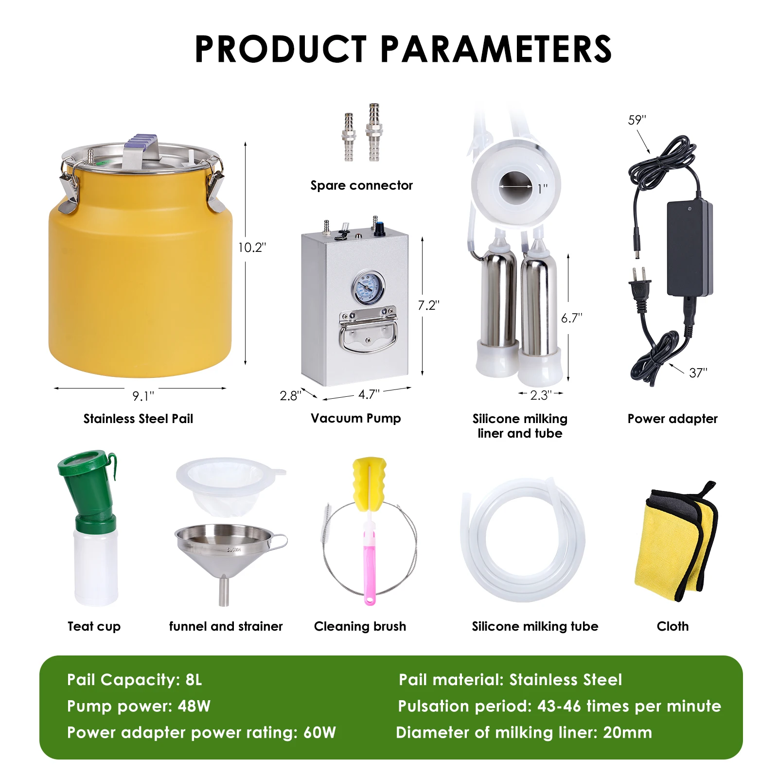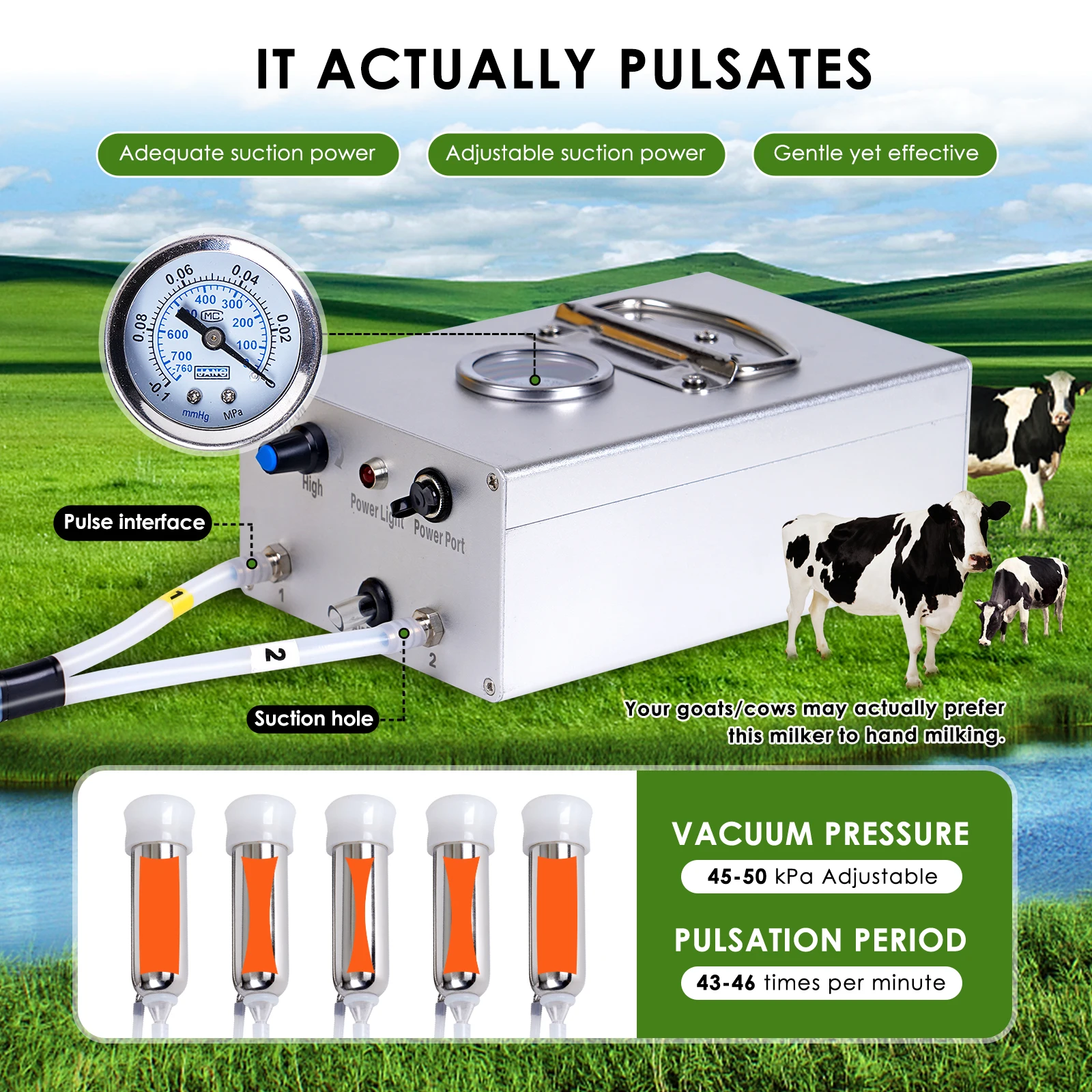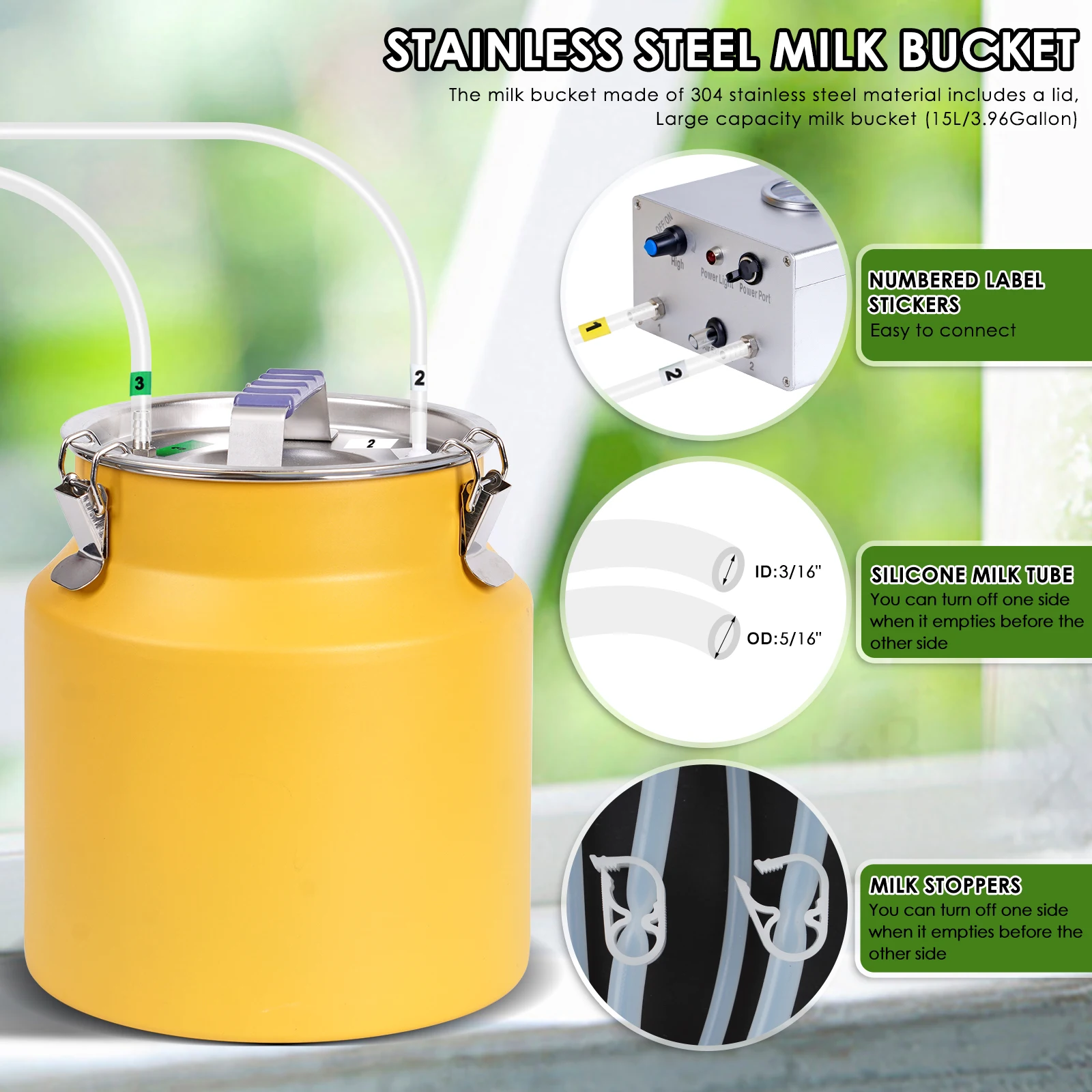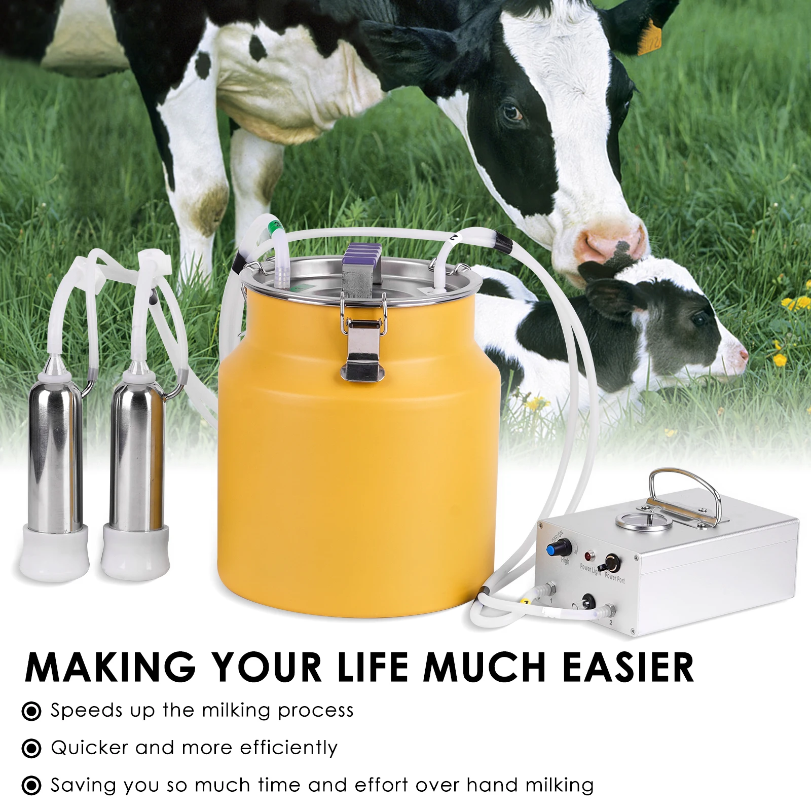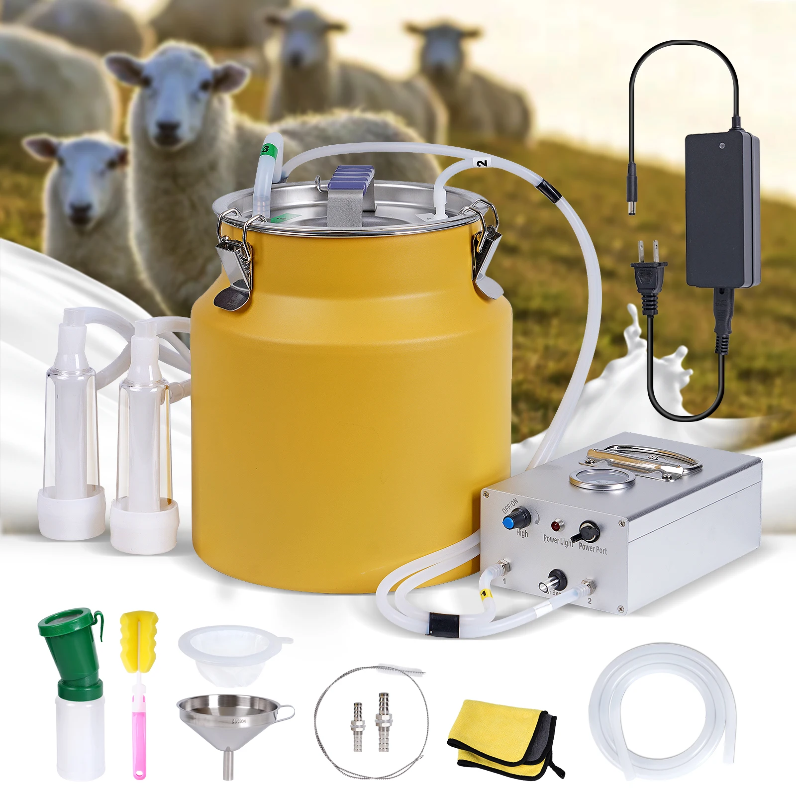 Máquina de ordeño de cabras y vacas de 8L, cubo de acero inoxidable, tazas de pulsación automáticas eléctricas, tubos de succión ajustable para vacas y ovejas