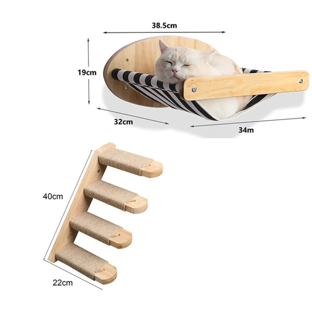 Marco de escalada para gatos de madera maciza: montado con una plataforma de salto de nido de juguete de pared con poste rascador para gatos y estantes de madera para escaleras