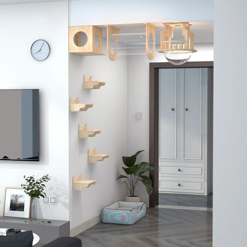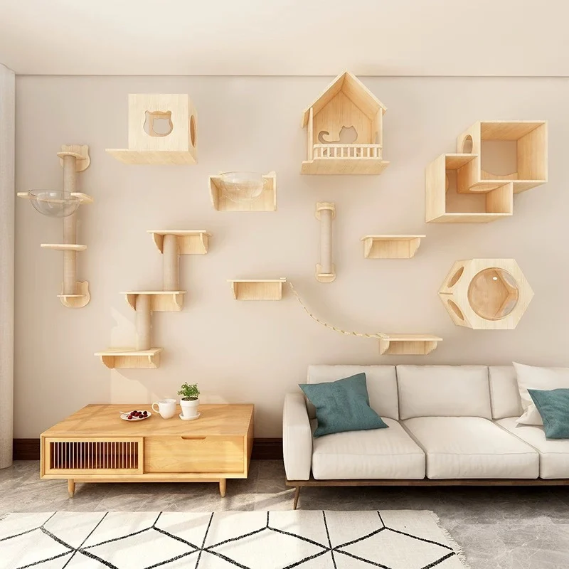 1.El diseño montado en la pared ahorra espacio en su habitación y es muy adecuado para escalar, dormir y hacer ejercicio.Apto para gatos de todas las edades.