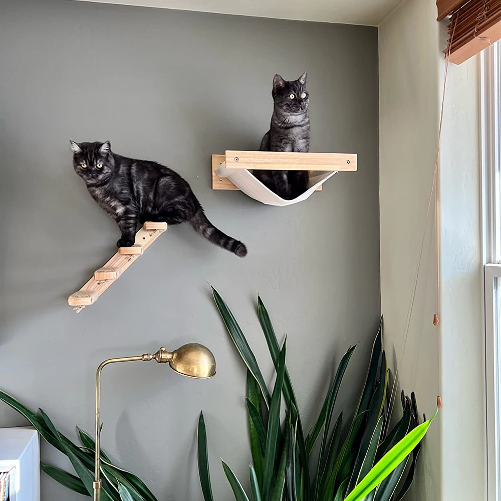 Marco de escalada para gatos montado en la pared de madera maciza, árbol para gatos, poste para rascar, hamaca, escalera, paradiso de pared para gatos de sisal