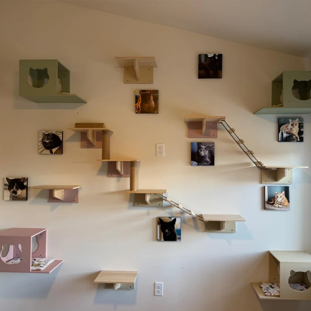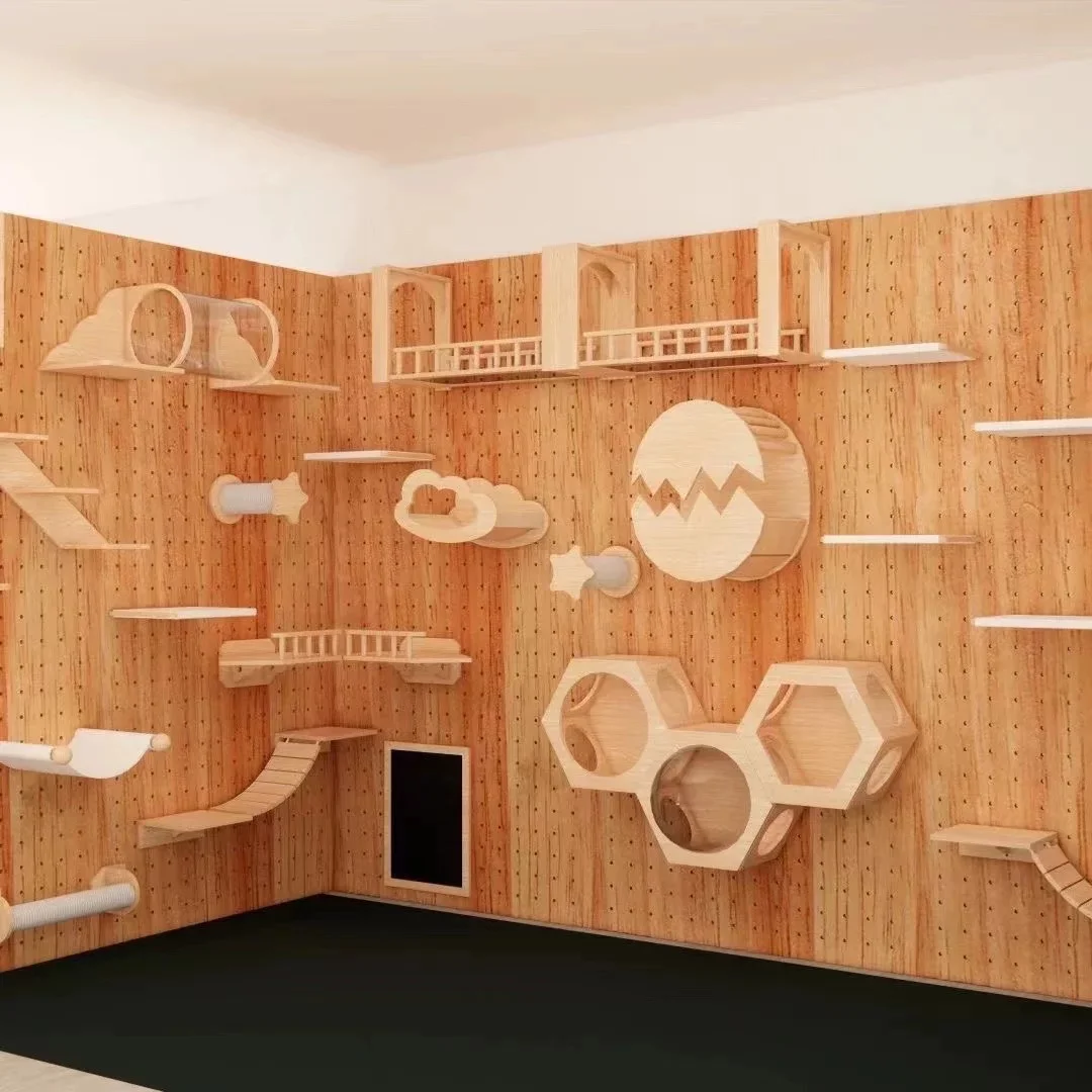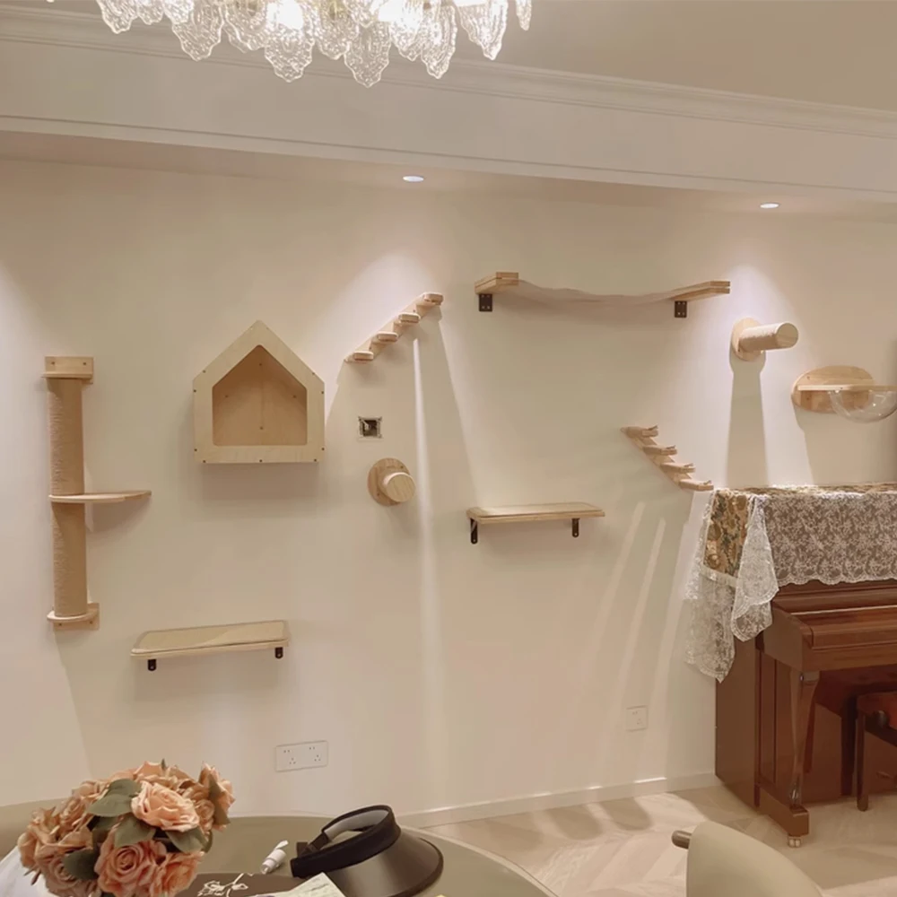 Se pueden combinar e instalar de manera flexible según el espacio de la pared, el diseño del hogar y los hábitos de actividad del gato. Ya sea una unidad pequeña compacta o un espacio grande y espacioso, se puede planificar inteligentemente para aprovechar al máximo el espacio vertical y crear un parque de atracciones exclusivo para gatos único, sin ocupar demasiado espacio en el suelo y mantener limpio el hogar.