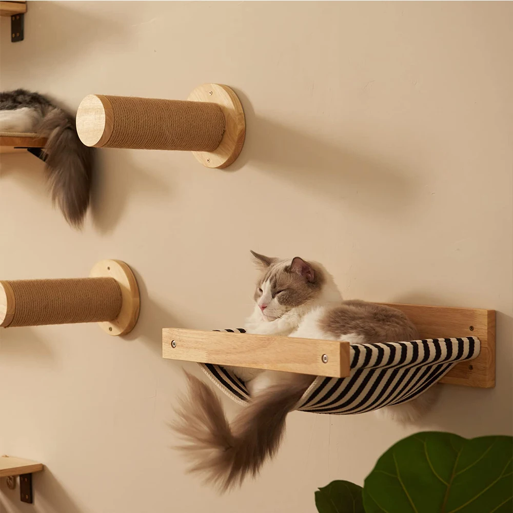 Los estantes de pared para gatos satisfacen el hábito de los gatos de escalar, aumentando el ejercicio y reduciendo la posibilidad de obesidad, lo que es bueno para la salud. Además, le da a los gatos espacio para trepar y evitar estropear el hogar.