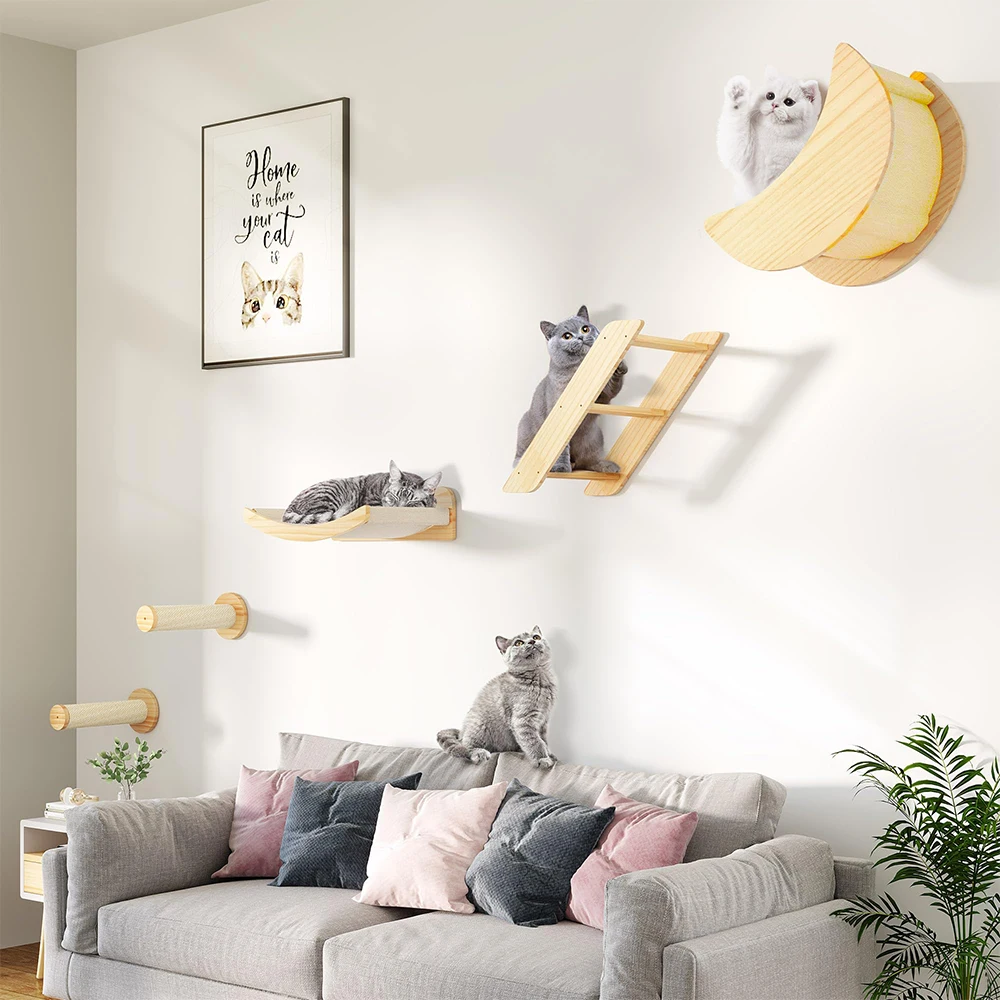 Los estantes de pared para gatos satisfacen el hábito de los gatos de escalar, aumentando el ejercicio y reduciendo la posibilidad de obesidad, lo que es bueno para la salud. Además, le da a los gatos espacio para trepar y evitar estropear el hogar.