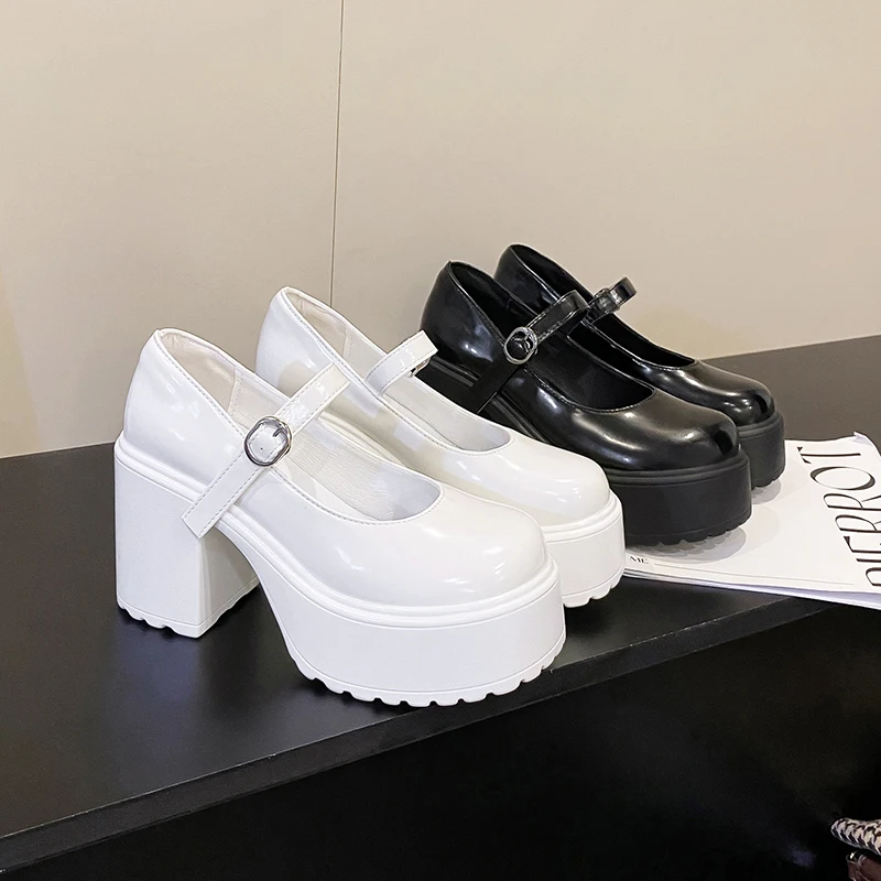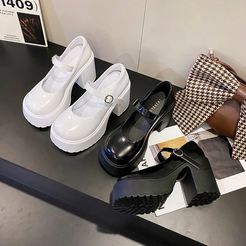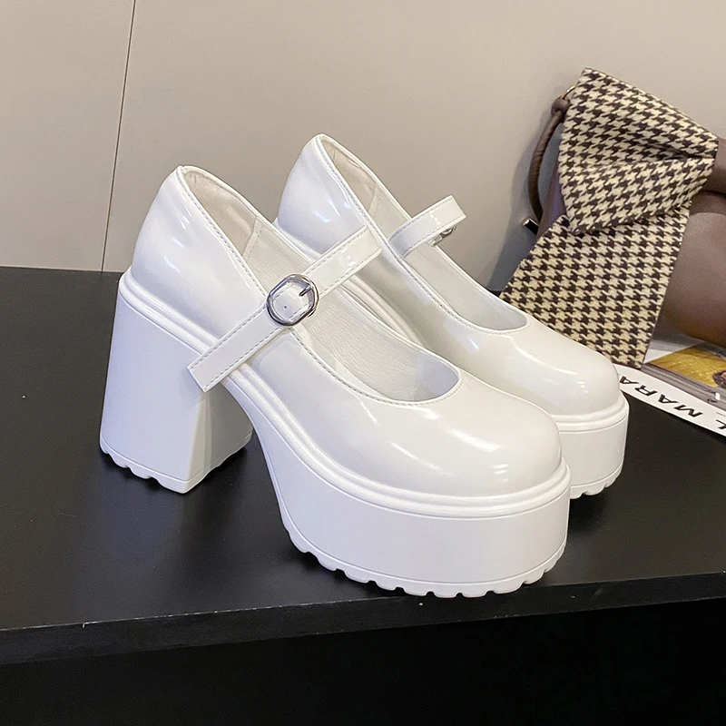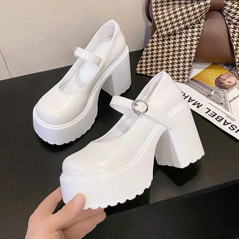 Mary Jane-zapatos de tacón alto con plataforma para mujer, calzado de tacón grueso con hebilla y Correa, estilo gótico, color blanco, a la moda, para fiesta