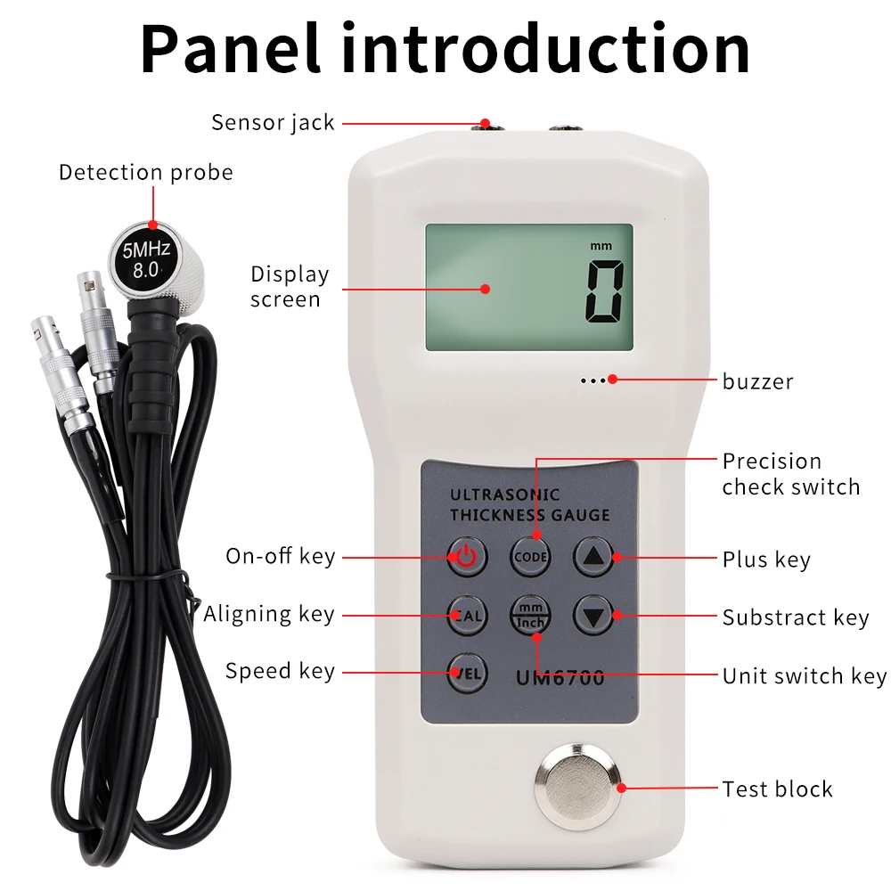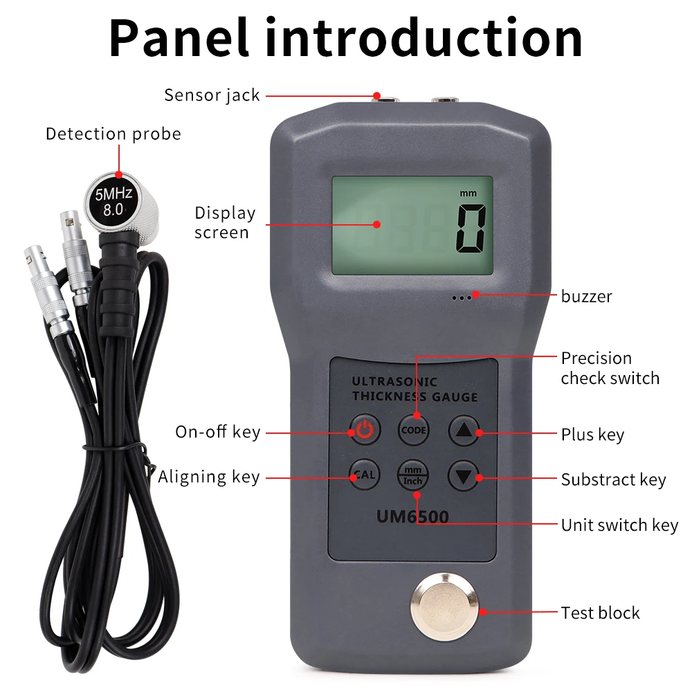 Aplicación Se utiliza para medir el espesor y la corrosión de recipientes a presión, equipos químicos, calderas, tanques de almacenamiento de aceite, etc.en las industrias del petróleo, la construcción naval, las centrales eléctricas y la fabricación de máquinas.Materiales medidos: cualquier material duro, incluidos acero, hierro fundido, aluminio, cobre rojo, latón, zinc, vidrio de cuarzo, polietileno, PVC, hierro fundido gris, hierro fundido nodular y otros materiales bien conductores de ondas ultrasónicas.