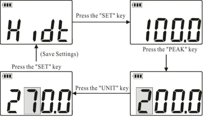 Presione la tecla "SET" para ingresar a la interfaz de configuración del sistema; luego presione la tecla "PEAK" para desplazarse hacia abajo y seleccionar el elemento de configuración o presione la tecla "UNIT" para desplazarse hacia arriba y seleccionar el elemento de configuración, confirme que presione el "SET". Tecla, salga y presione la tecla "ZERO".