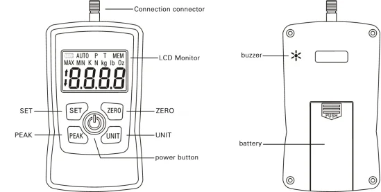 Presione la tecla "PEAK" y las palabras "P" y "T" se mostrarán en la pantalla al mismo tiempo son el primer modo pico.En este modo, el instrumento solo muestra el primer valor máximo medido en un período de tiempo y el valor medido no se mostrará nuevamente.Si hay un cambio, presione la tecla "ZERO" para borrarlo antes de realizar la prueba nuevamente.