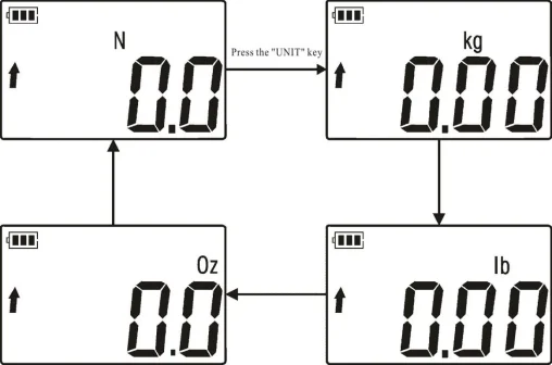 2.3 N(Newton),Kg (Kilograma),Lb (Libra) y Oz(Ounce) cuatro unidades para selección y conversión.