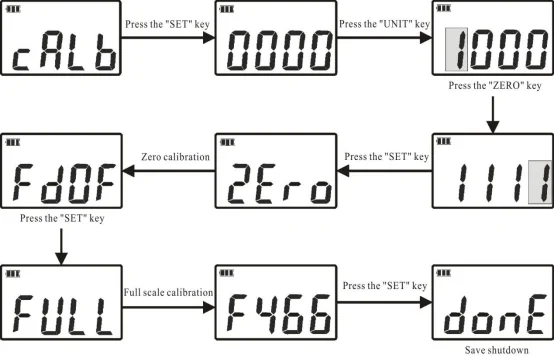 7.9 Calibración del usuario: este elemento de configuración es la función de calibración del instrumento.Seleccione este menú y presione la tecla "SET" para ingresar la contraseña "1111" para ingresar a la interfaz de calibración.Primero muestre "ZERO" para iniciar la calibración y calibración de escala cero, presione la tecla "SET" después de la calibración, muestre "FULL" para iniciar la calibración y calibración de escala completa, presione la tecla "SET" para guardar la calibración después de la calibración y el instrumento se apagará automáticamente.Como se muestra a continuación:
