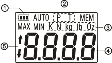 2 La pantalla muestra simultáneamente "P" y "T" como el primer modo de pico, lo que indica que se registra el primer valor de pico medido dentro de un período de tiempo;la pantalla muestra un solo "P" como modo pico, lo que indica que el período de tiempo medido se registra el valor máximo de fuerza;Presione la tecla "PEAK" para cambiar libremente entre el modo pico y el primer pico.