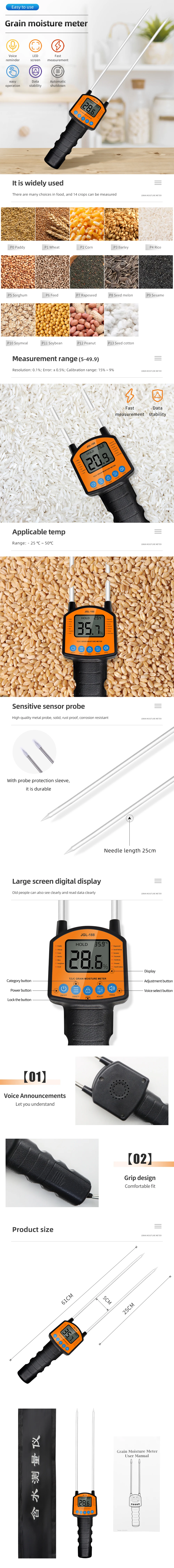 Los medidores de humedad se utilizan para medir el porcentaje de agua en una sustancia determinada.Esta información se puede utilizar para determinar si el material está listo para su uso, está inesperadamente húmedo o seco, o de lo contrario necesitar una inspección adicional.Los cereales se pueden medir: colza, sésamo, harina de soja, algodón, soja, maní, cebada, arroz, sorgo, semillas de sandía, arroz, trigo, maíz, forraje.