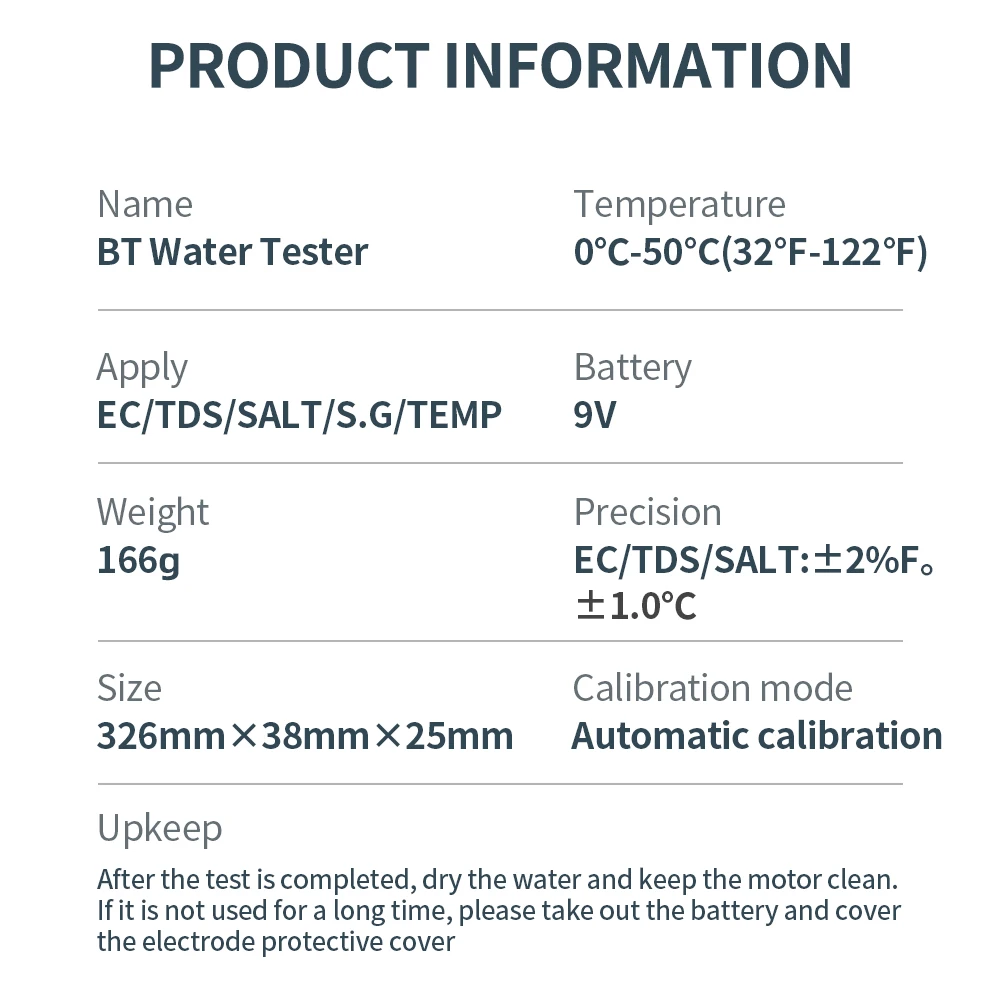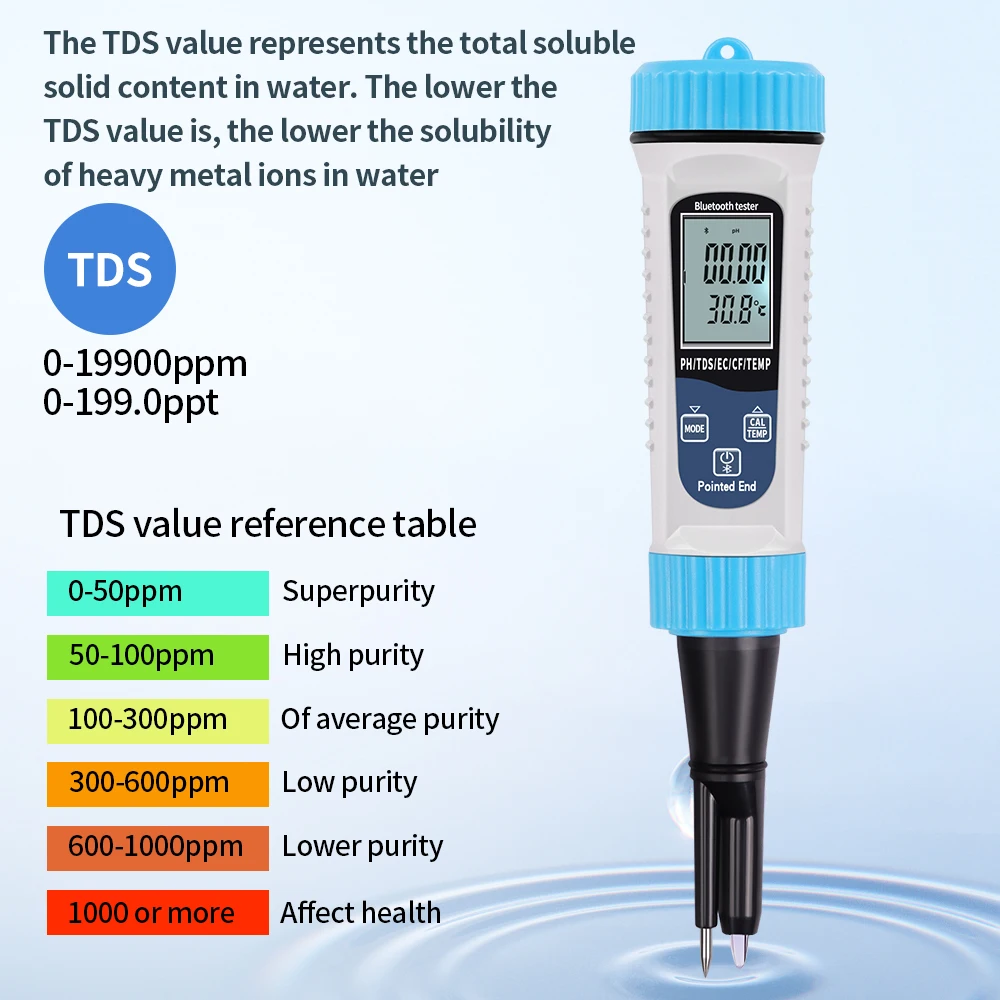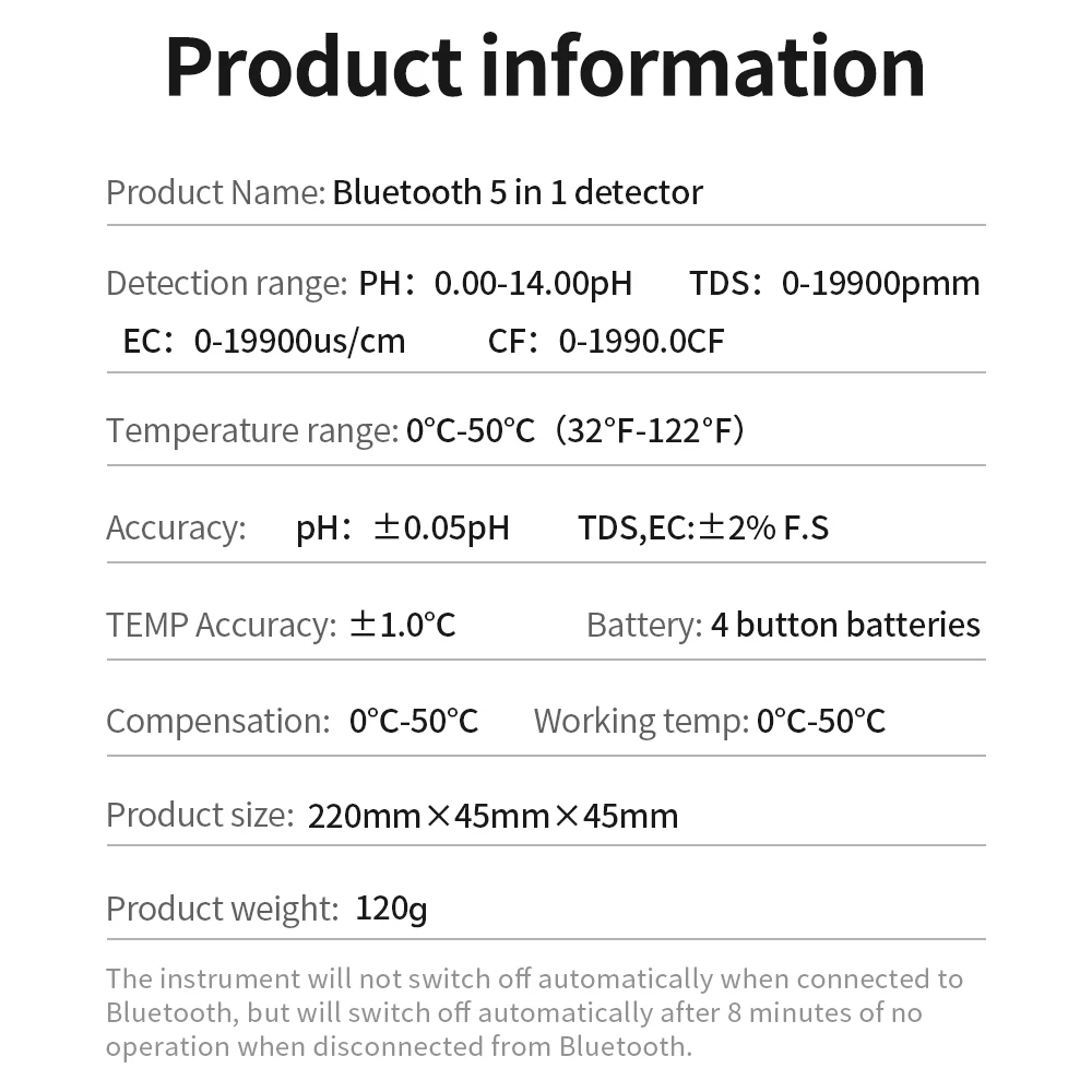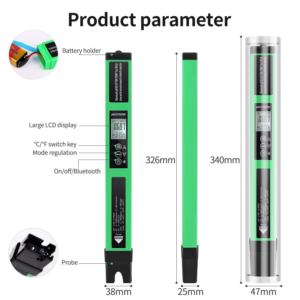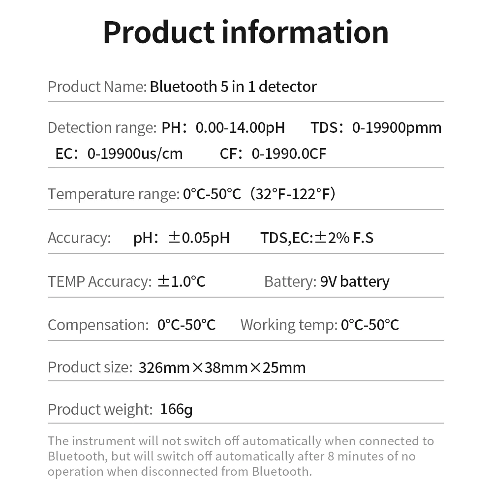 Lista de embalaje: 1 * Bluetooth PH/TDS/EC/CF/medidor de Calidad de Agua de temperatura