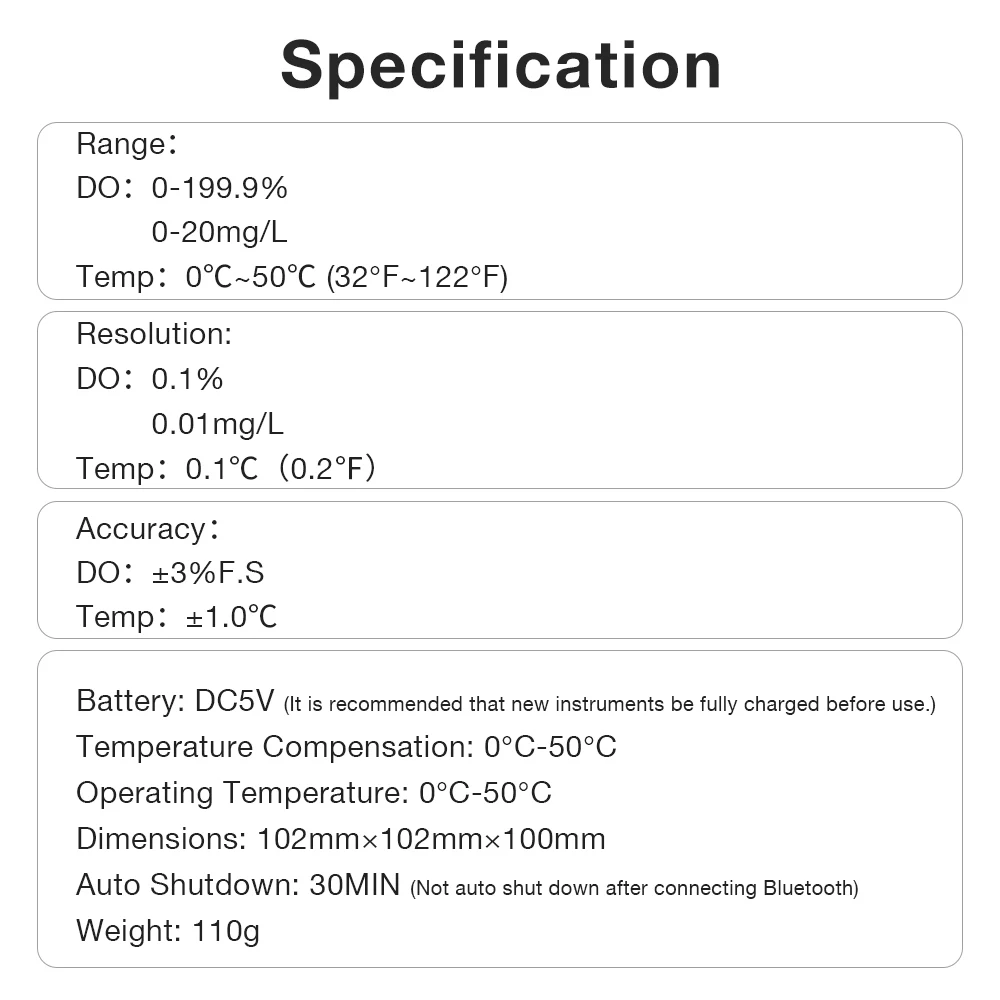 DO-BT088 es un instrumento de precisión utilizado para medir oxígeno disuelto y temperatura.La carcasa de este instrumento tiene función impermeable.Y es inteligente y se puede controlar a través de Tuya Bluetooth.Analizador de oxígeno disuelto (unidad de medición): expresado en porcentaje de saturación (%) o concentración de oxígeno (mg/L).