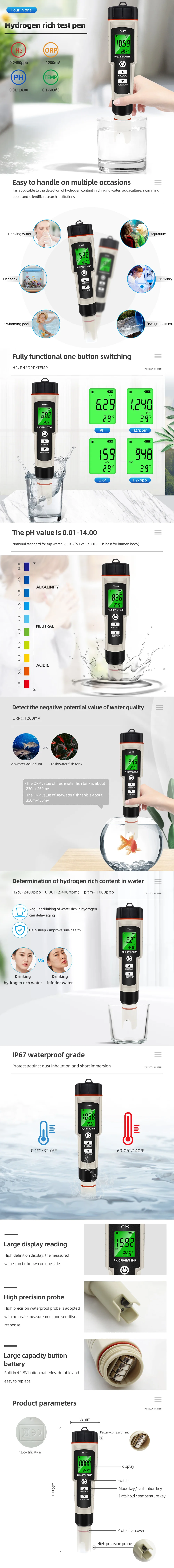 Este producto es un comprobador multifuncional de calidad del agua de alta precisión recientemente desarrollado, que tiene las funciones de medir el PH, El ORP, la concentración de iones de hidrógeno y la temperatura del agua. Se actualizan los datos de medición de compensación automática de temperatura (0-60 °C). Preciso, fácil de operar, fácil de transportar, beber mucha agua rica en iones de hidrógeno es bueno para la salud.