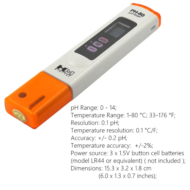 El PH-80 mide el pH y la temperatura. Las características incluyen calibración digital automática de un toque, cuerpo resistente al agua, pantalla de temperatura simultánea, diseño elegante y liviano, una gran pantalla LCD, compensación automática de temperatura (ATC), función de apagado automático, función de retención de datos e indicador de batería baja. Cada medidor incluye una solución de almacenamiento y un paquete de tampón de pH 7,0 de un solo uso.