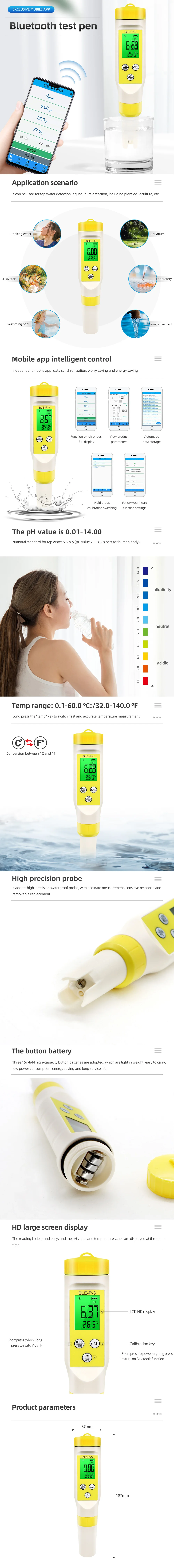 Medidor de PH portátil, Monitor en línea Compatible con Bluetooth, probador de calidad del agua potable, Control por aplicación, bolígrafo de prueba de PH para piscinas de acuario