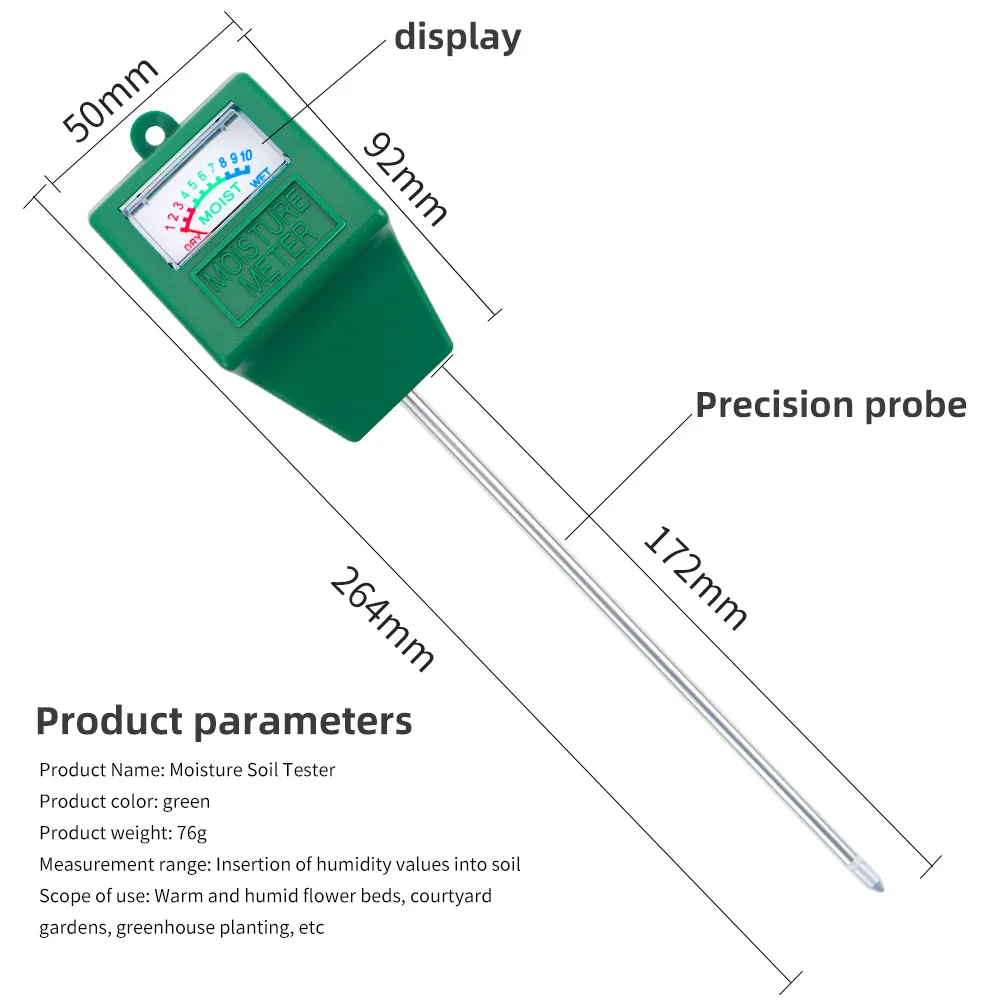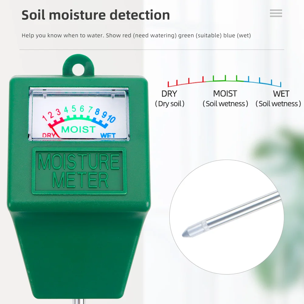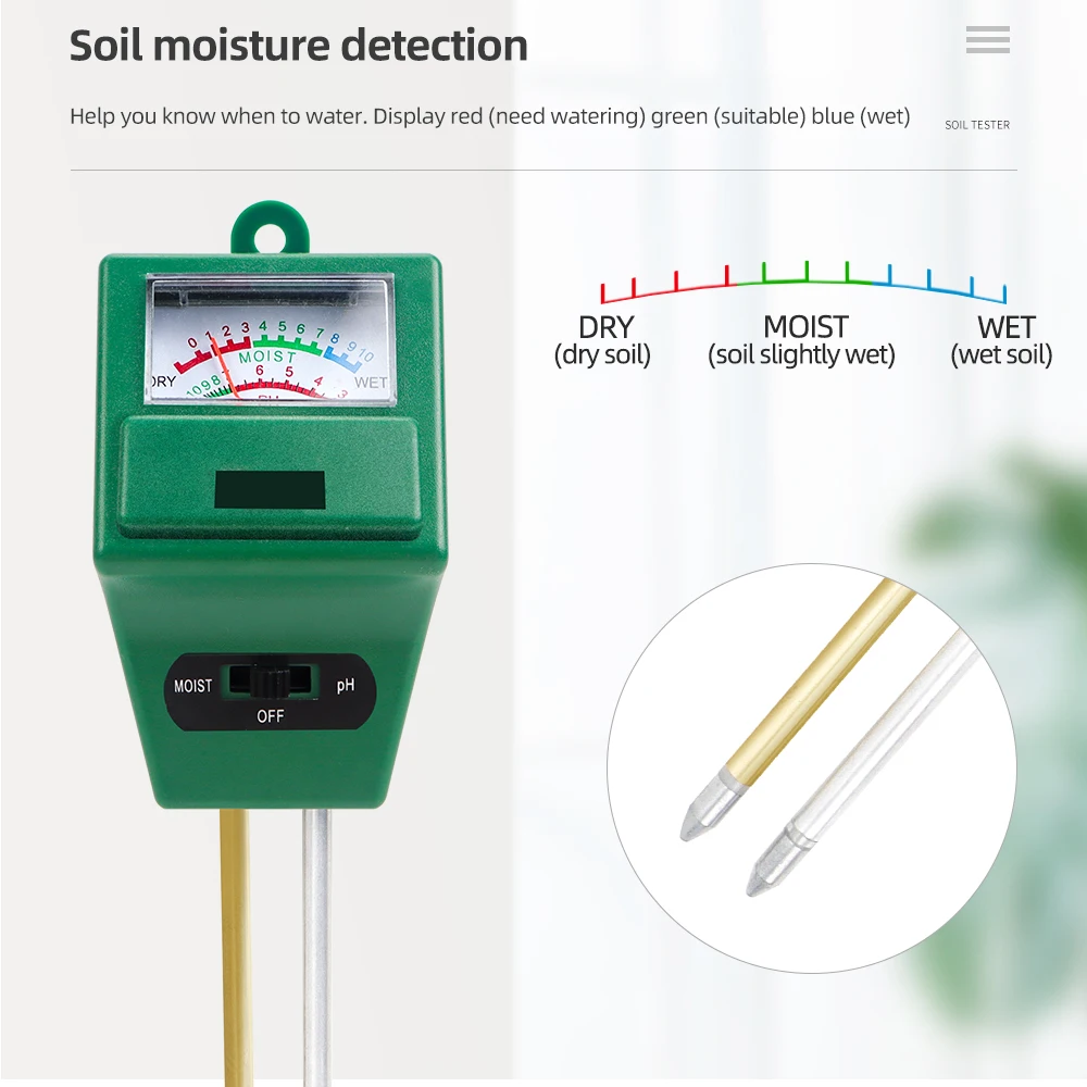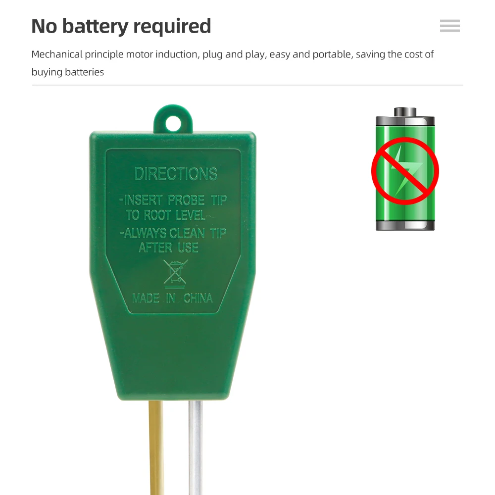 4. Este producto es el más adecuado para detectar suelos nutritivos, y el valor detectado será más preciso. Para suelos arenosos, rojos y otros suelos con baja densidad o demasiado fangosos, es posible que la aguja del medidor no se mueva debido a la mala conductividad del suelo, y puede cambiar la prueba. Comprobación ambiental.