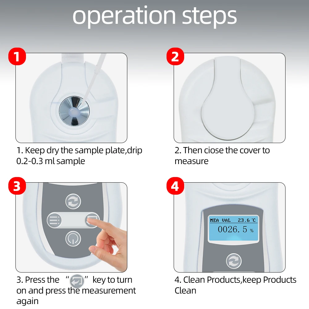 Al agregar la muestra a la piscina de medición, no se debe utilizar la cuchara de metal para evitar rayar la superficie del prisma. Si las temperaturas de la muestra son diferentes de la temperatura de la superficie del prisma, la muestra debe colocarse en la piscina de medición durante un período de tiempo antes de medir.