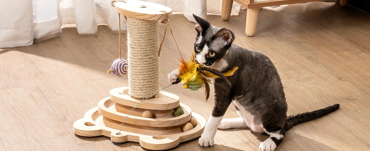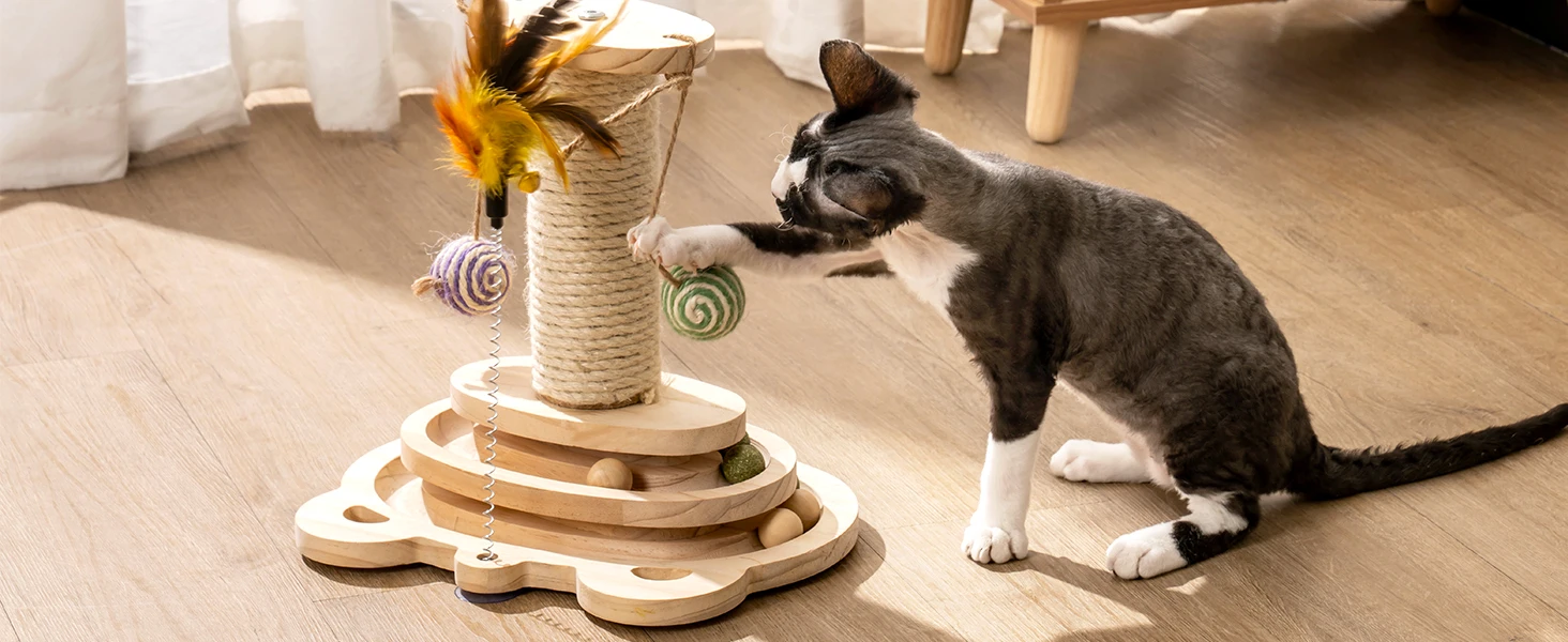 Este exclusivo juguete para gatos combina la diversión del juego interactivo con la funcionalidad de un rascador.Elaborado con madera duradera, ofrece estabilidad y robustez superiores en comparación con los juguetes de plástico, lo que garantiza que se mantenga seguro sin tambalearse ni volcarse, perfecto para gatitos y gatos enérgicos.