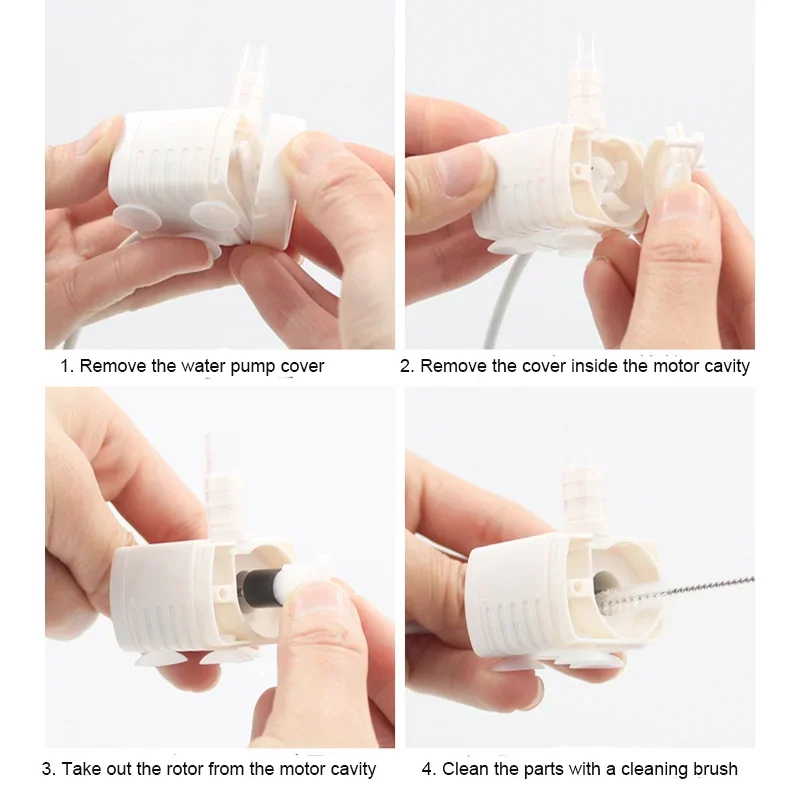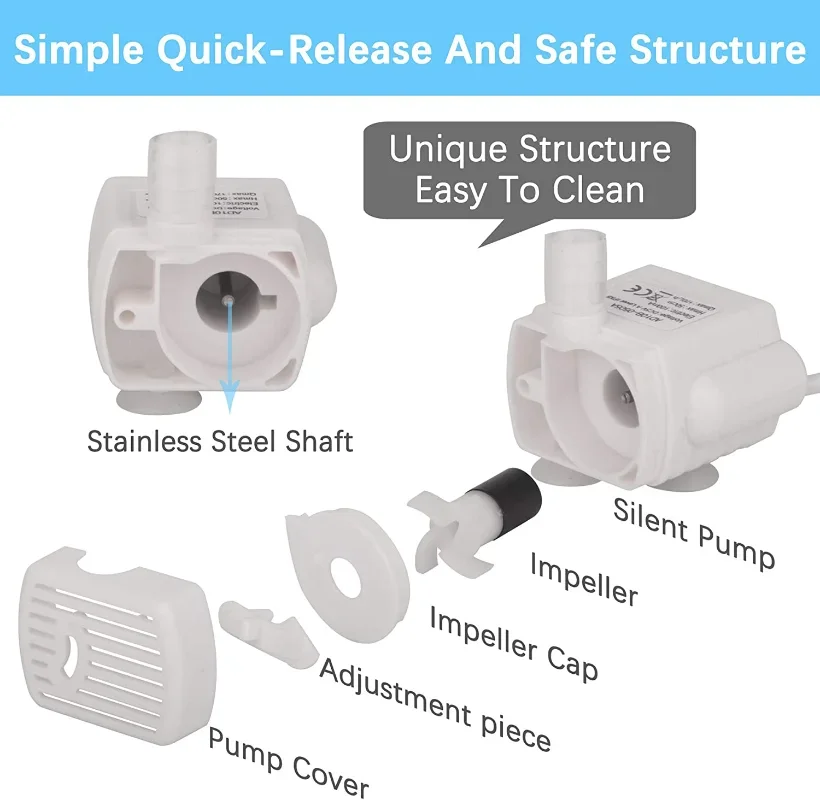 La bomba de bebedero para mascotas es compacta, por lo que no ocupará mucho espacio de instalación en la fuente.