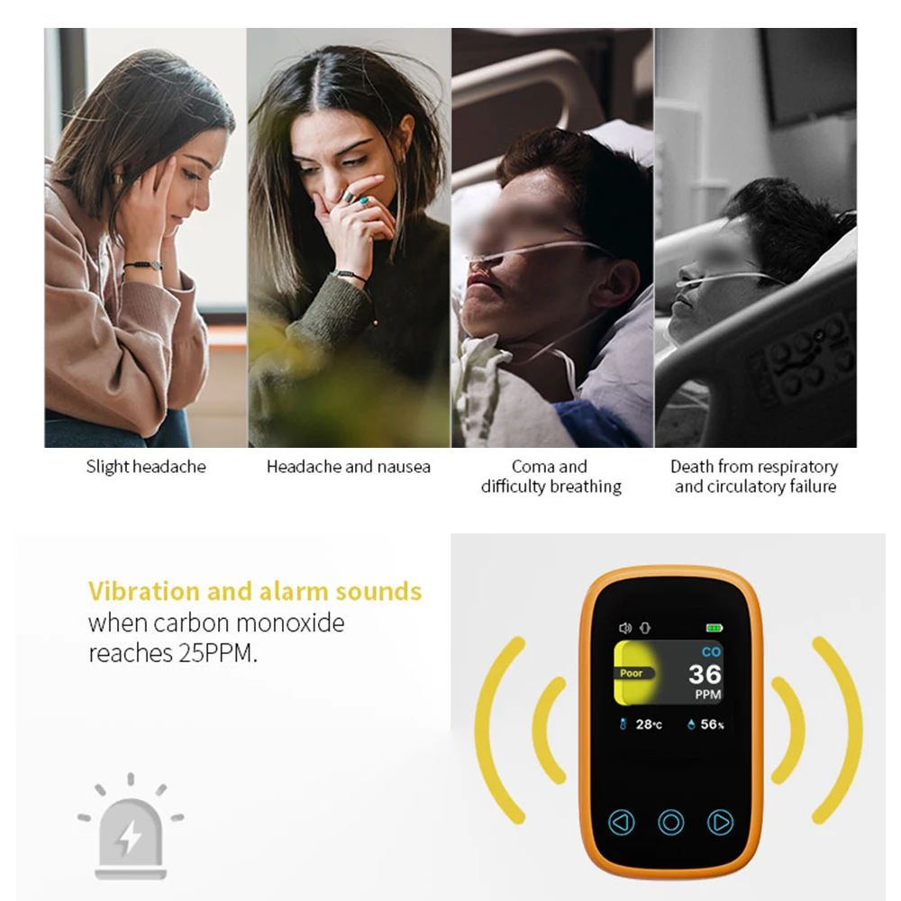 【Clasificación de calidad del aire y alarma inteligente】: Equipado con una función de clasificación de calidad del aire, 4 colores diferentes corresponden a diferentes clases de concentración de CO, lo que le permite comprender la aire acondicionado actual de manera más precisa y gráfica.Cuando la concentración de monóxido de carbono alcanza los 25 ppm, el dispositivo vibrará automáticamente y promoverá una alarma sonora, recordándole que tome medidas oportunas para proteger su salud y la de su familia.