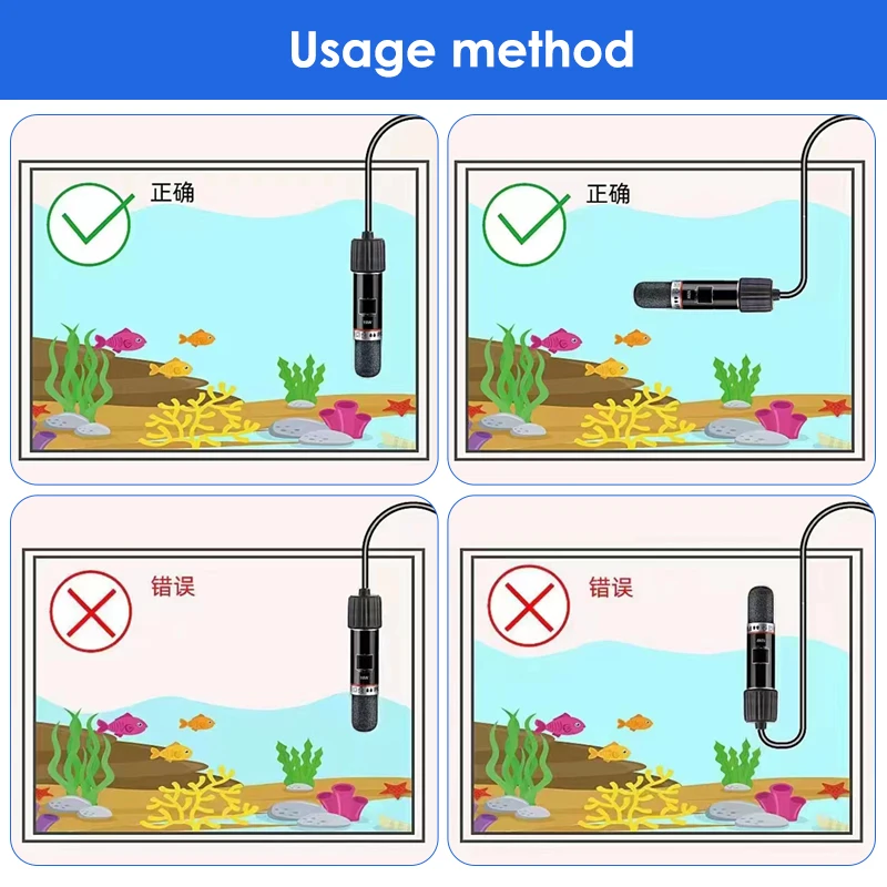 3.Se pueden usar dos barras calefactoras en una pecera para aumentar la capacidad de calentamiento; por ejemplo, se pueden usar dos barras calefactoras simultáneamente en una pecera con capacidad de agua de 4 litros.