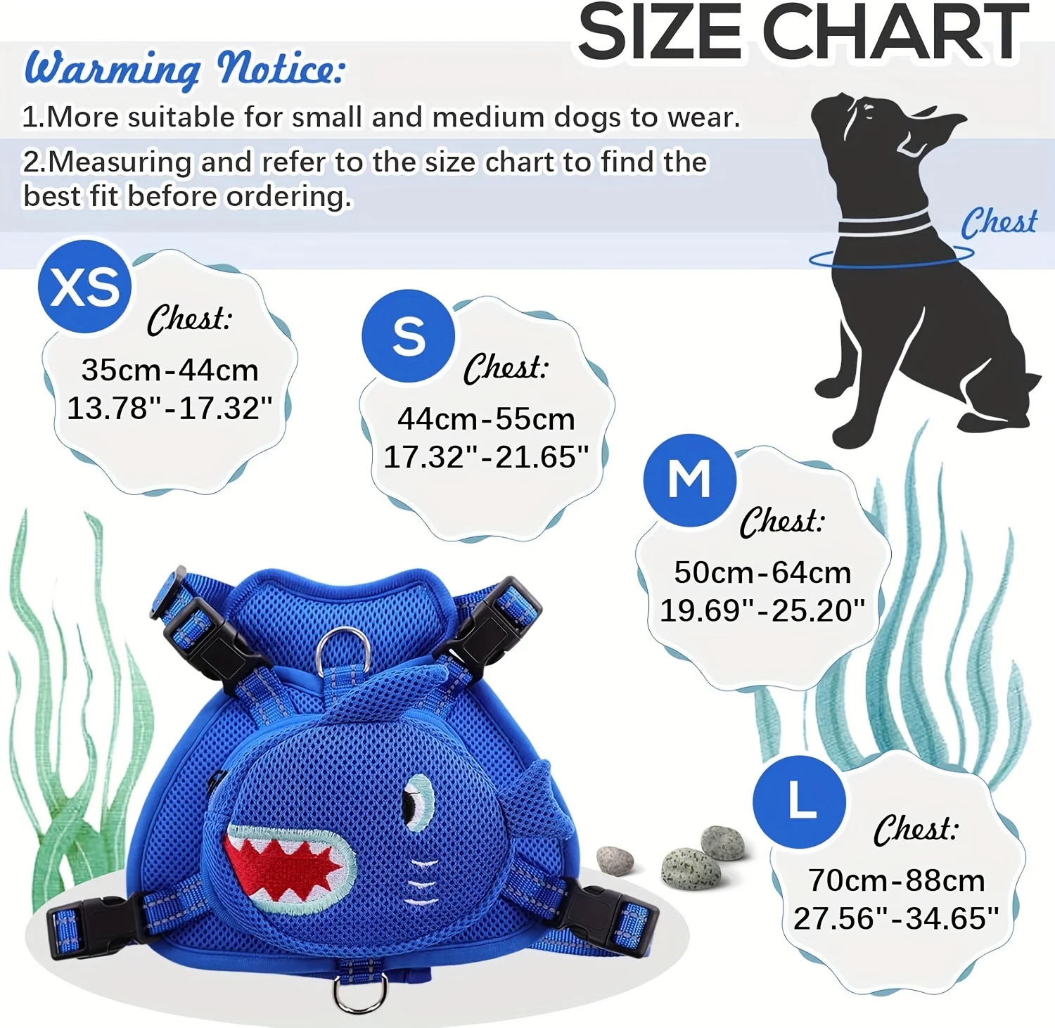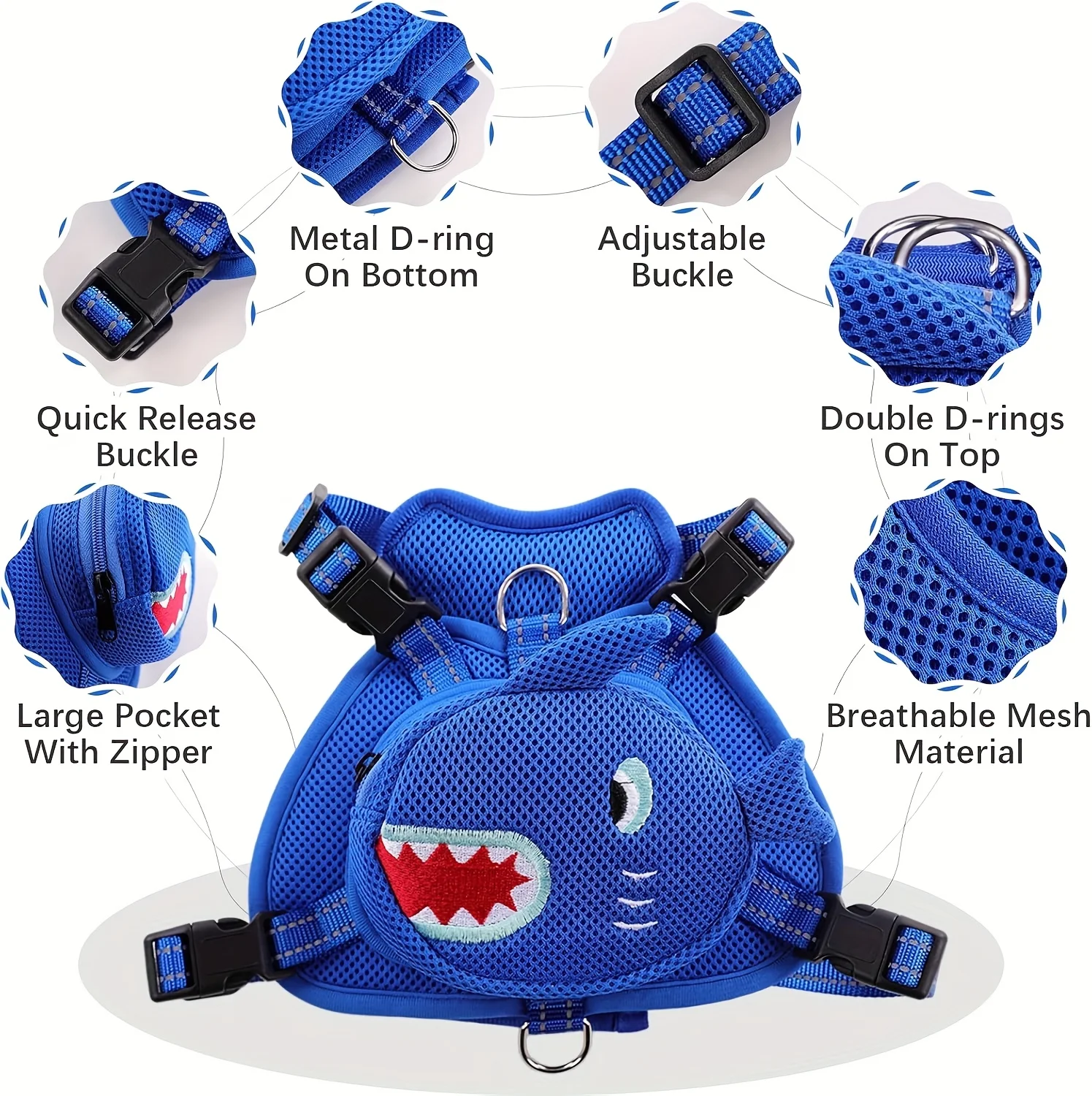 GRAN CAPACIDAD: La mochila con arnés para perros tiene una bolsa principal con diseño de cremallera en la parte posterior, combina con una linda forma de tiburón azul, que es llamativa y tiene una gran capacidad.La mochila con chaleco para perros puede transportar comida y refrigerios para perros, tazones y tazas plegables, pequeñas botellas de agua, juguetes y llaves.