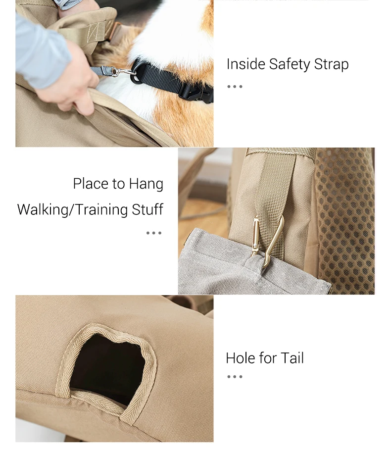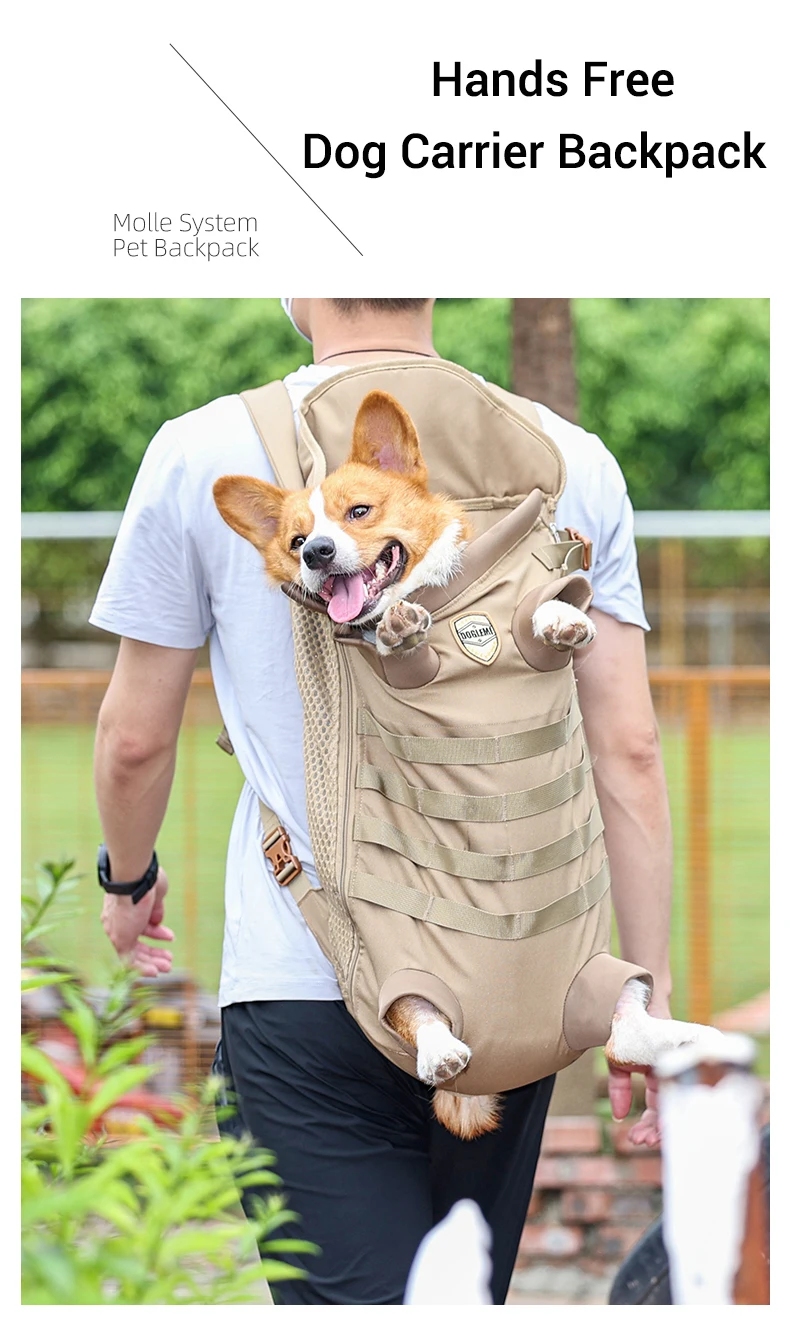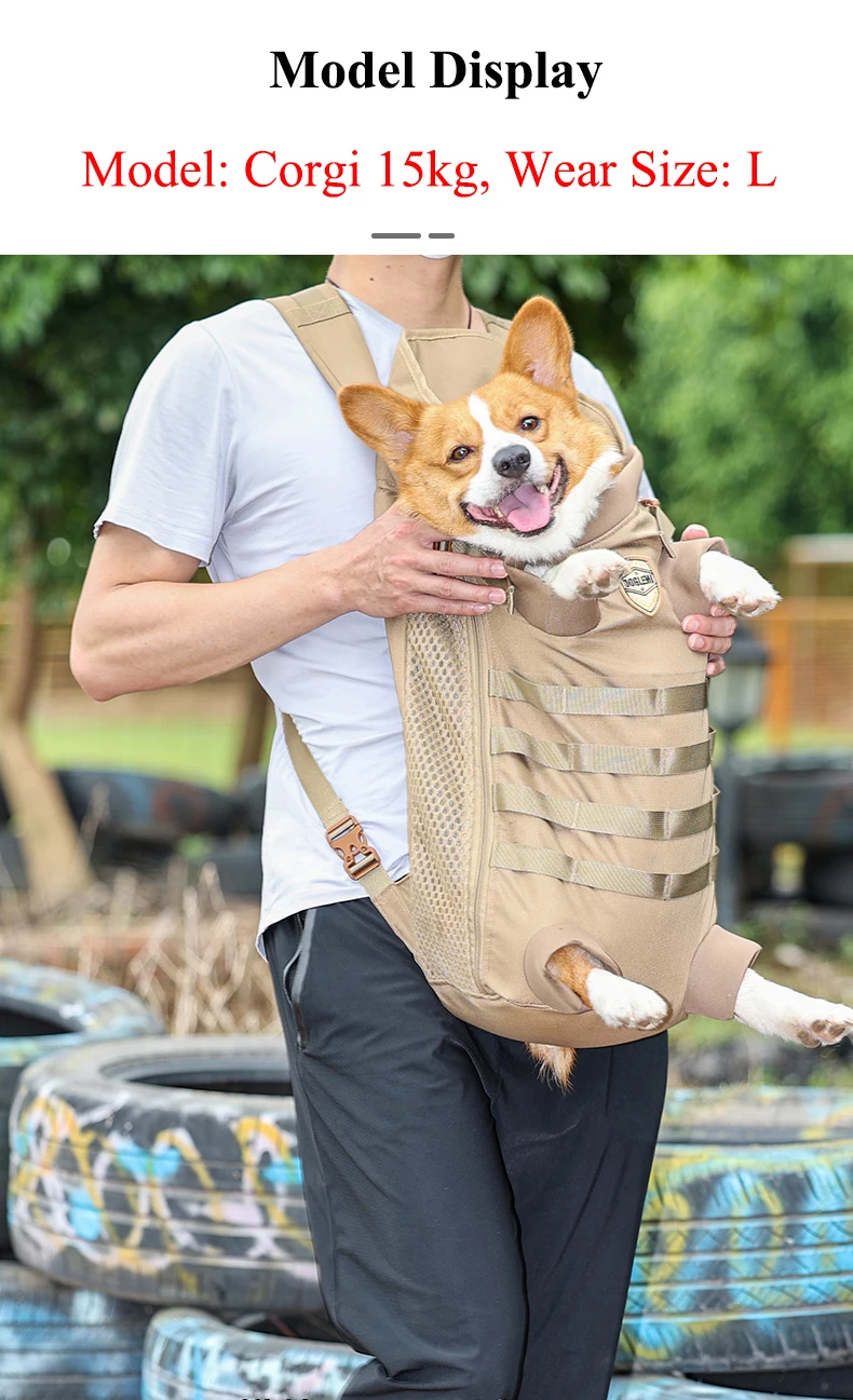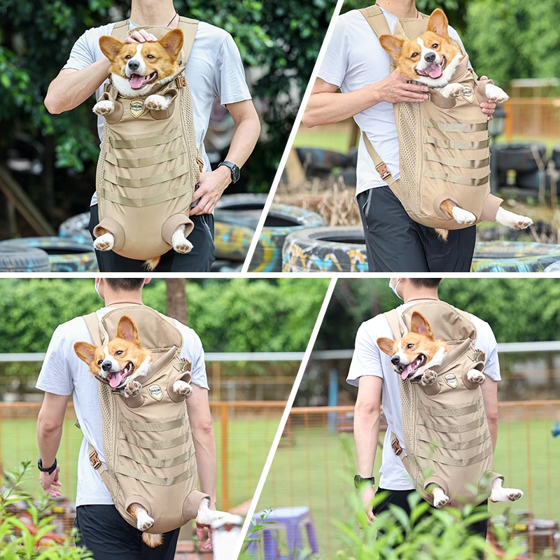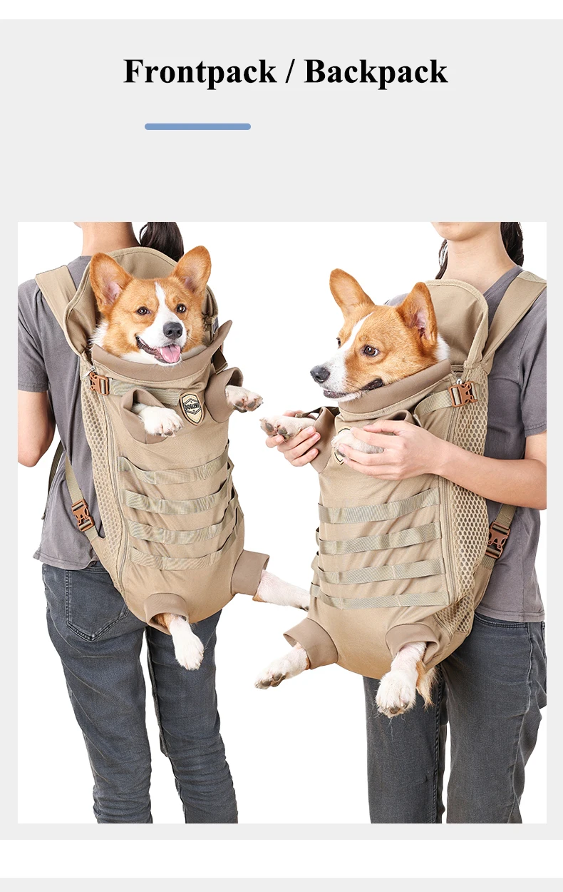 Mochila para perros pequeños y medianos, manos libres, táctica, para exteriores, Frontpack para mascotas, suave, transpirable, seguridad, viaje, portador de perros, bronceado militar