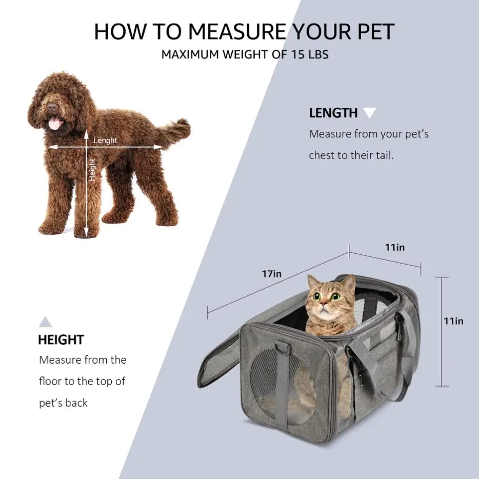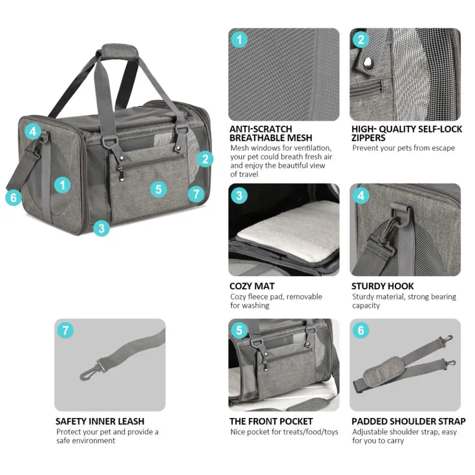Hay múltiples bolsillos en el exterior para guardar fácilmente artículos pequeños como comida para mascotas, correas, juguetes, etc., manteniendo su equipo de viaje organizado y fácilmente accesible.