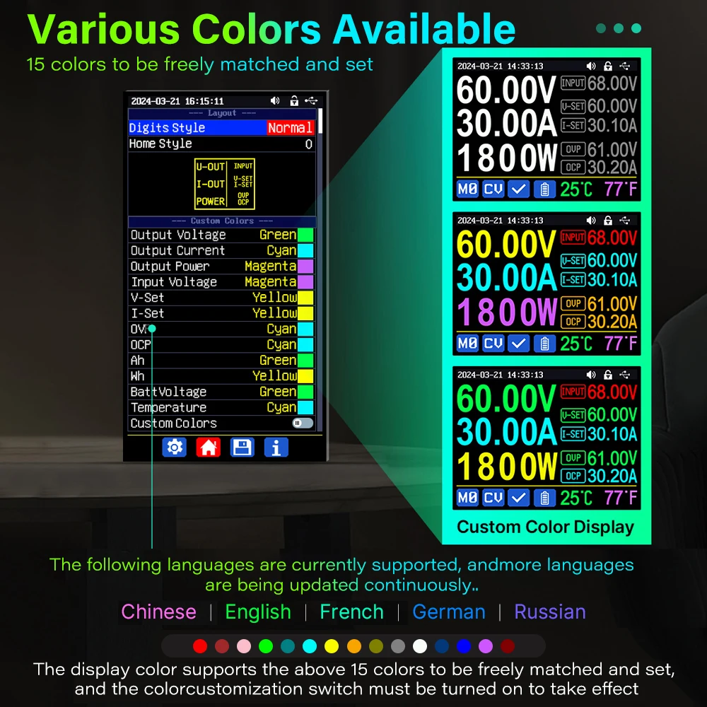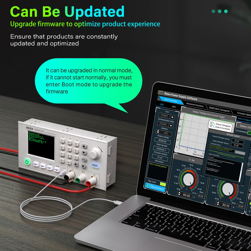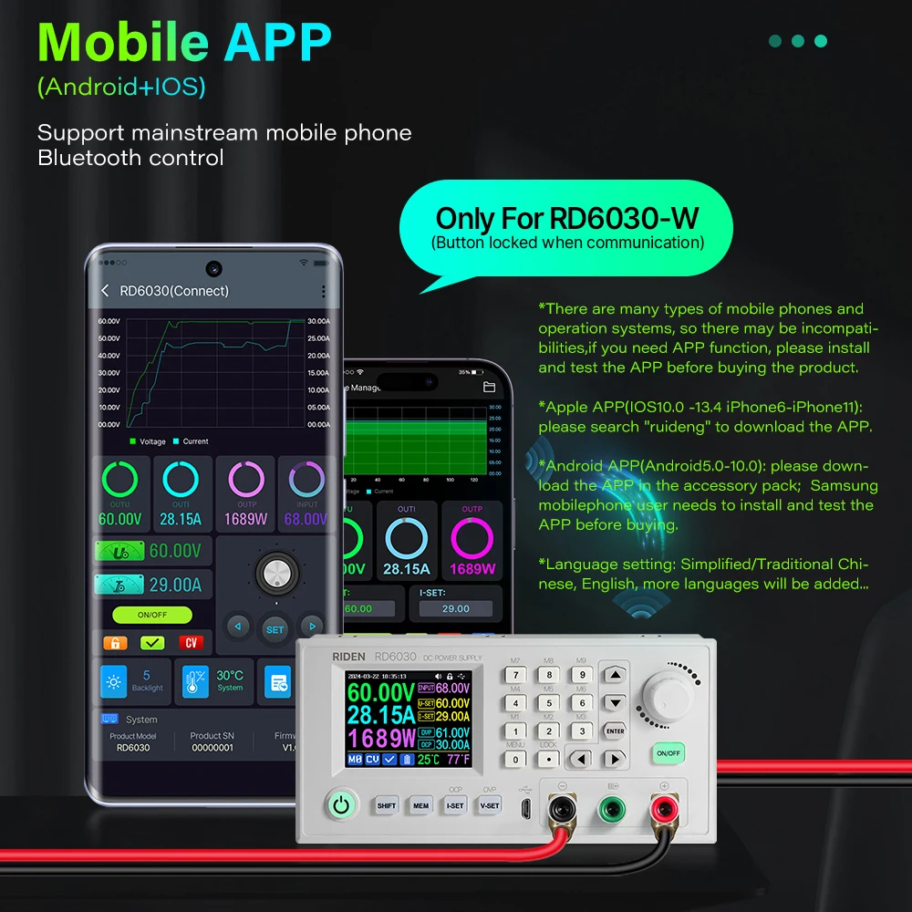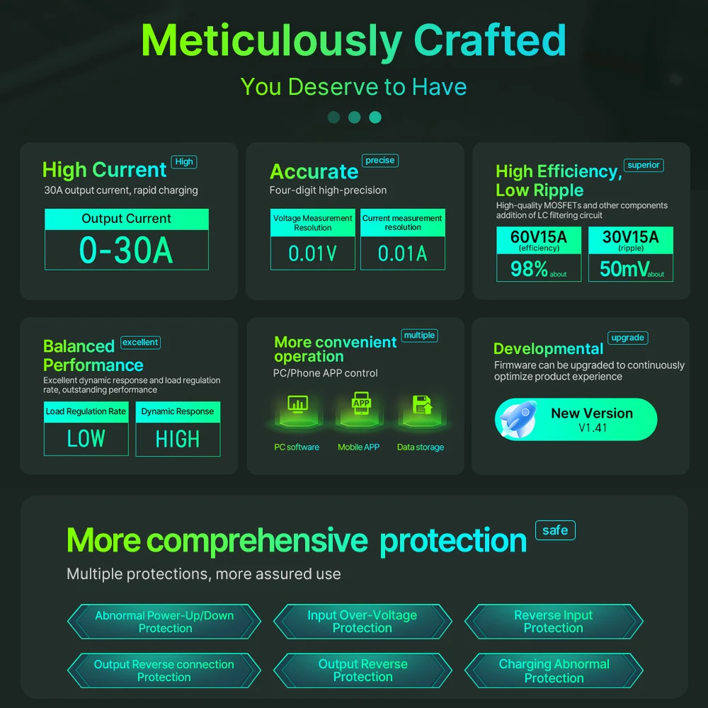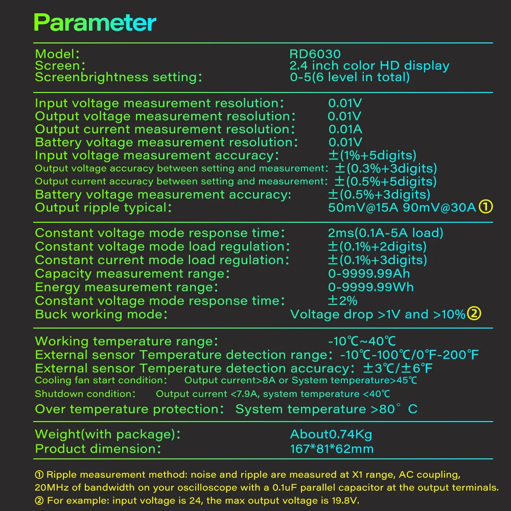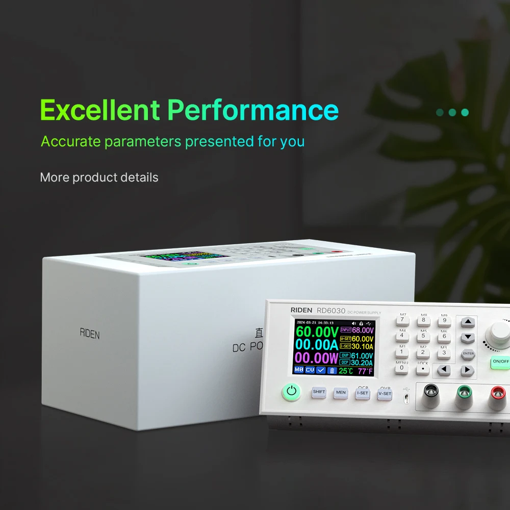 El producto de la serie RD6030 no es solo una solución de energía de alto rendimiento estable, sino también una moderna herramienta de administración de energía que incorpora un diseño inteligente y fácil de usar, con el objetivo de brindar a los usuarios una experiencia superior y un rendimiento eficiente.Proporciona una potente salida de voltaje de 60 V, alta corriente de 30 A y potencia de 1800 W.
