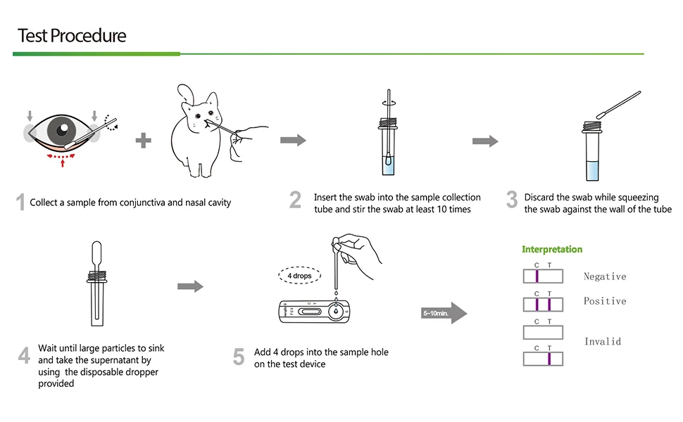 Resultado rápido y preciso: La precisión de la prueba se puede lograr al 99% con resultados en 5-10 minutos, lo que puede eliminar todos los peligros potenciales y mejorar la calidad de vida de las mascotas. Limpio e higiénico.