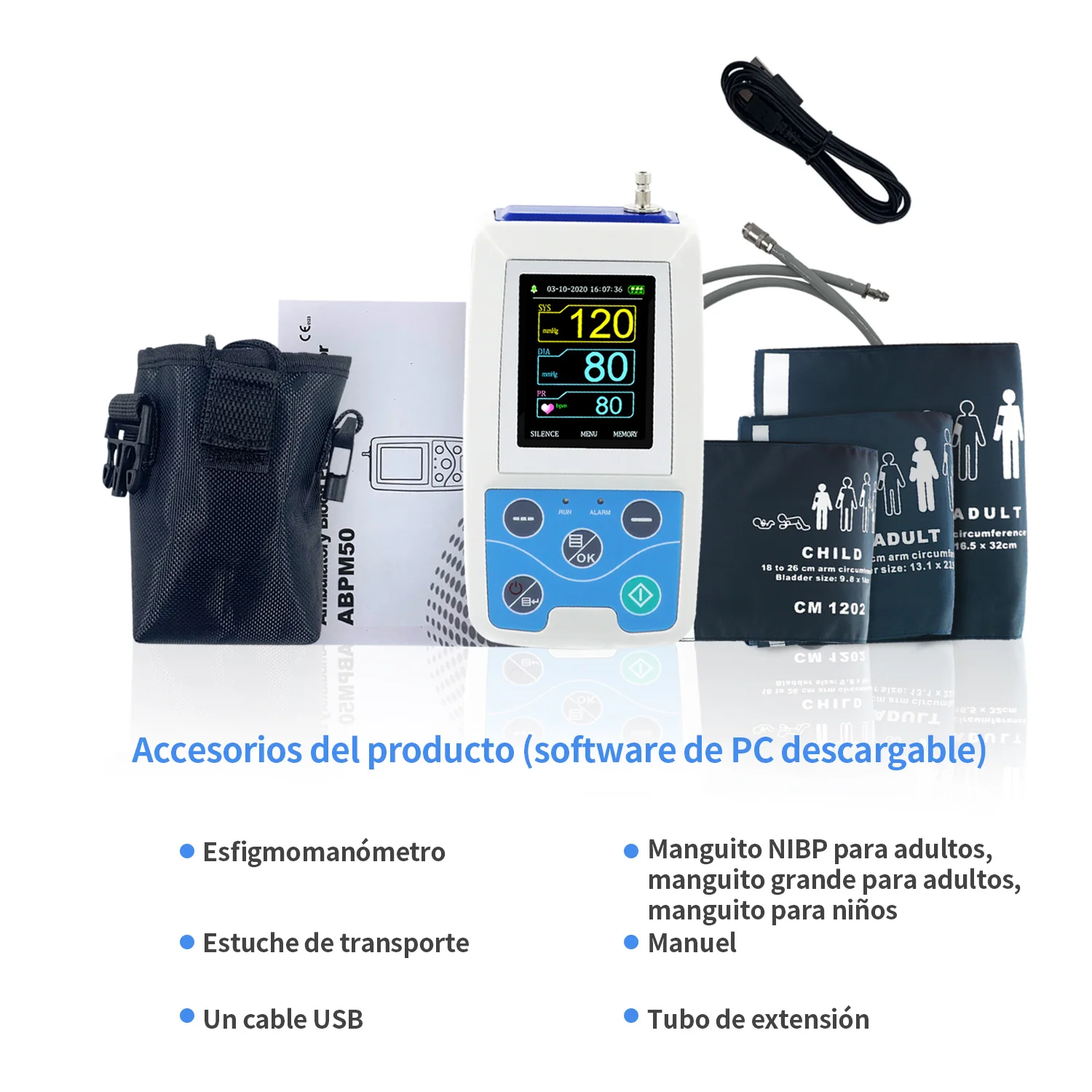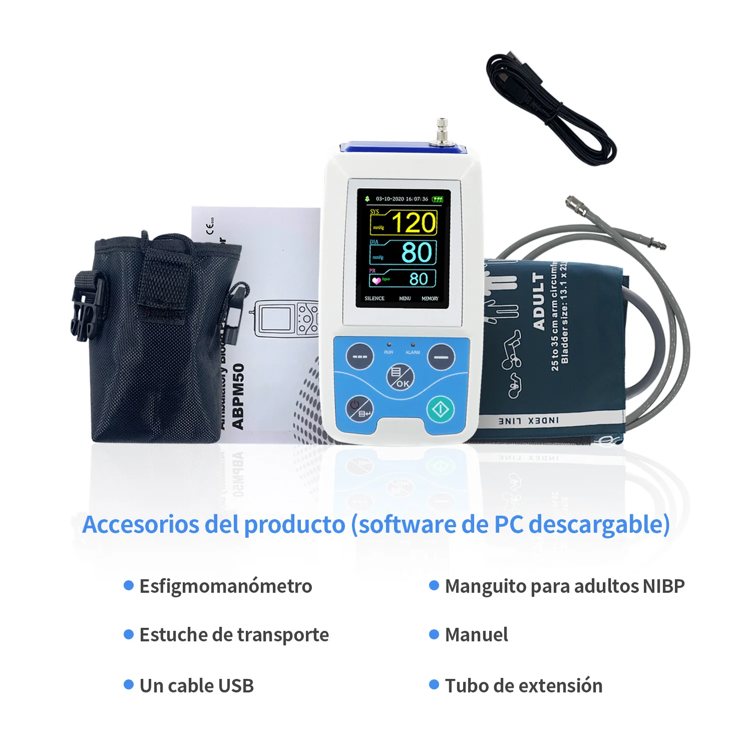 Características del producto:1) compacto y portátil, interfaz de usuario-amigo, fácil de usar2) Rango de pacientes: adultos, pediátricos, neonatos3) 24 horas de función de monitoreo ambulatorio NIBP, se pueden registrar hasta 350 grupos de datos ambulatorios NIBP por una vez.4) combinación perfecta de método de medición automático y manual, se pueden registrar hasta 300 grupos de datos por una vez mediante medición manual.5) Pantalla TFT a color de alta definición, gran visibilidad6) por interfaz de revisión de datos como "Lista de datos","gráfico de tendencia","Fuente Grande", los datos NIBP son claros de un vistazo7) Visualización de aviso de baja potencia, alarma, mensaje de error y hora8) Suministro de dos tipos de unidades: mmHg / kPa9) La interfaz de visualización se puede cambiar entre chino e inglés10) La función de eliminación de alarma de parámetros es opcional11) Comunicarse con PC, el software de PC puede lograr la revisión de datos, análisis de resultados medidos, vista del gráfico de tendencias, Impresión de informes y otras funcionesCaracterísticas del Software:1) conectar al dispositivo necesita descargar en línea (contatc me).2) Descargue el resultado de la medida NIBP desde el dispositivo terminal.3) visualización del gráfico de tendencia en forma de cuchara, gráfico de tendencia tipo relleno, histograma, gráfico de pie, gráfico de línea de relación.4) Editar los datos NIBP y anotar.5) edite la información básica, el consejo del médico, las instrucciones de estado del NIBP, la información actual sobre las medicinas, etc.6) admite la impresión de informes y la vista previa de impresión.Rendimiento